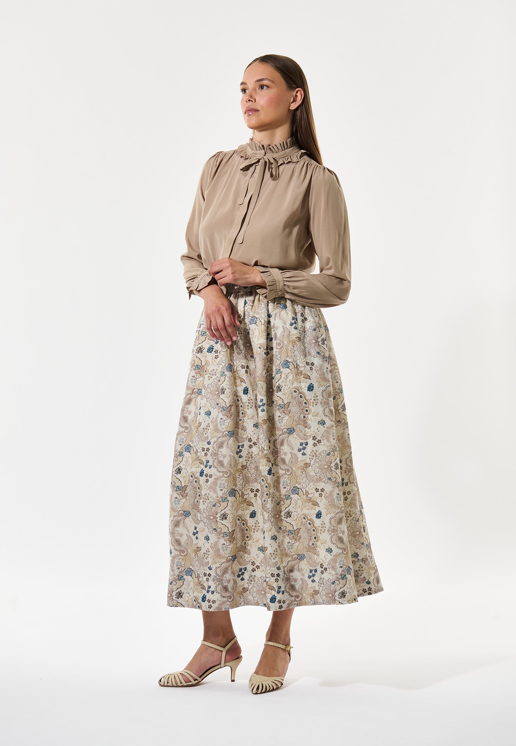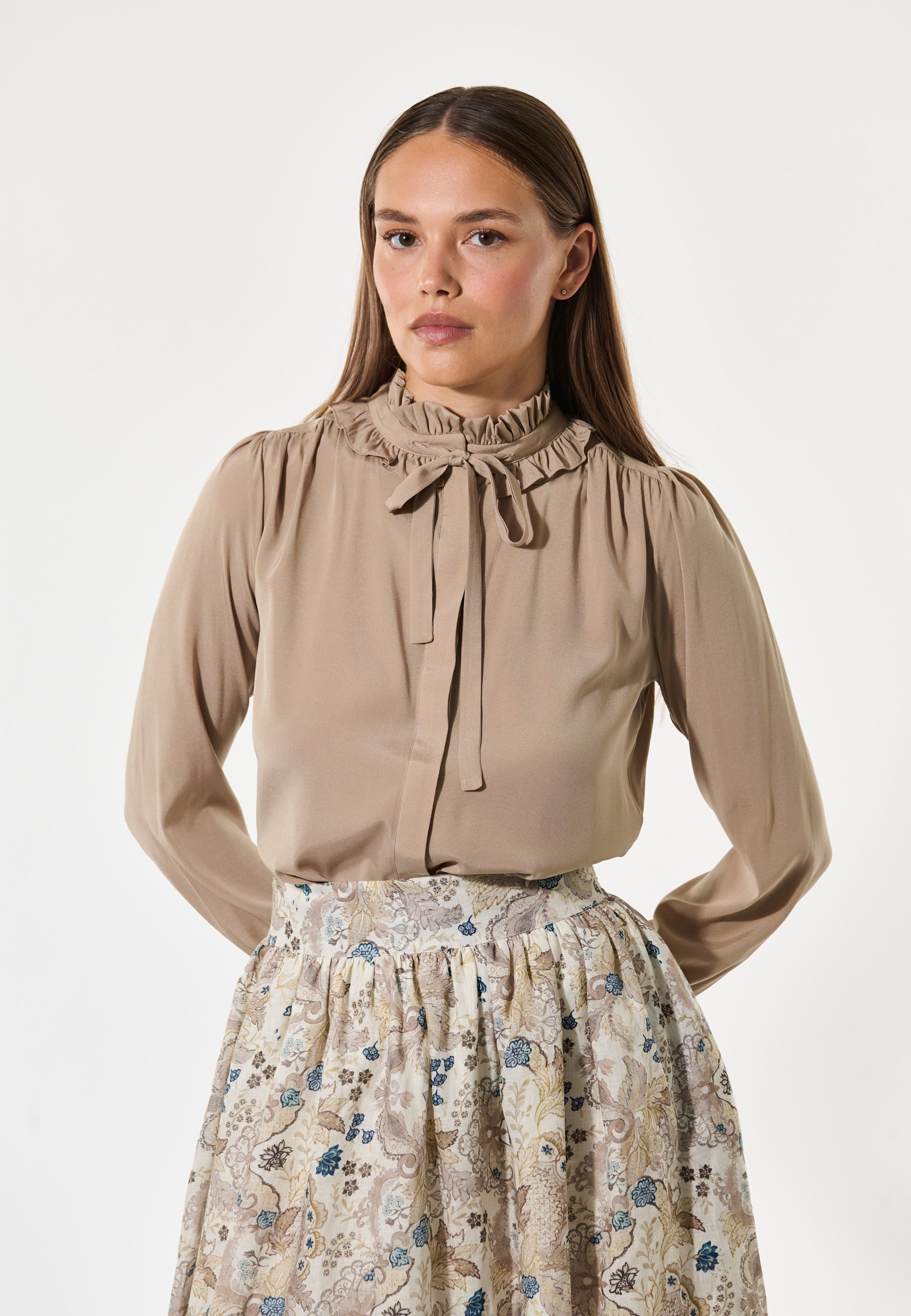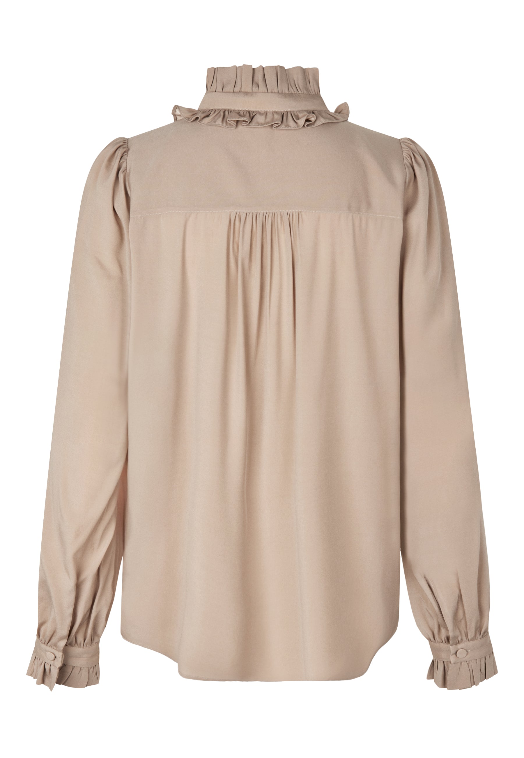 Smuk silkeskjorte med feminine detaljer. Skjorten med skjultknaplukning har flæsekrave med bindebånd, ærme med puf, samt rynk og flæse ved håndledet.