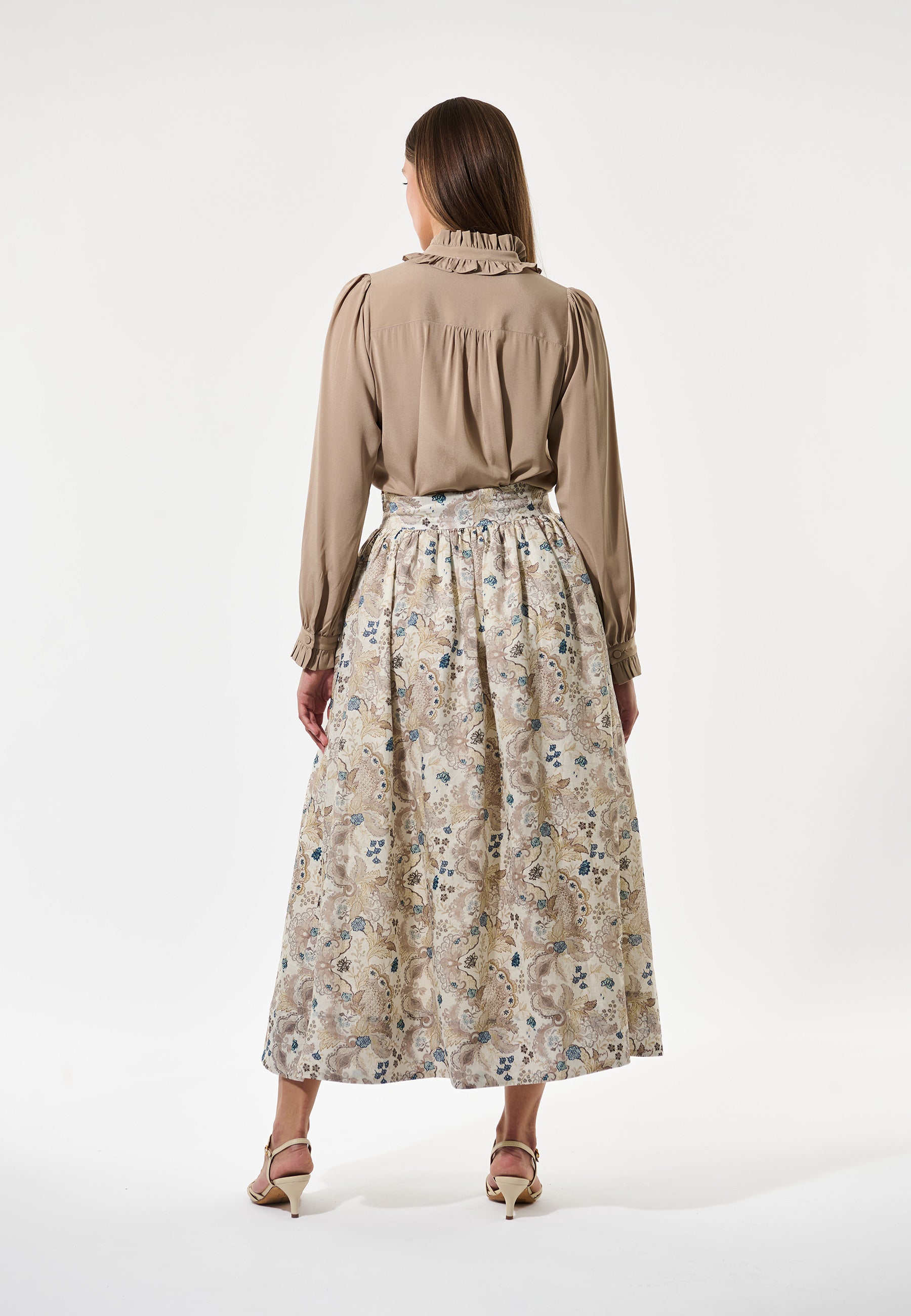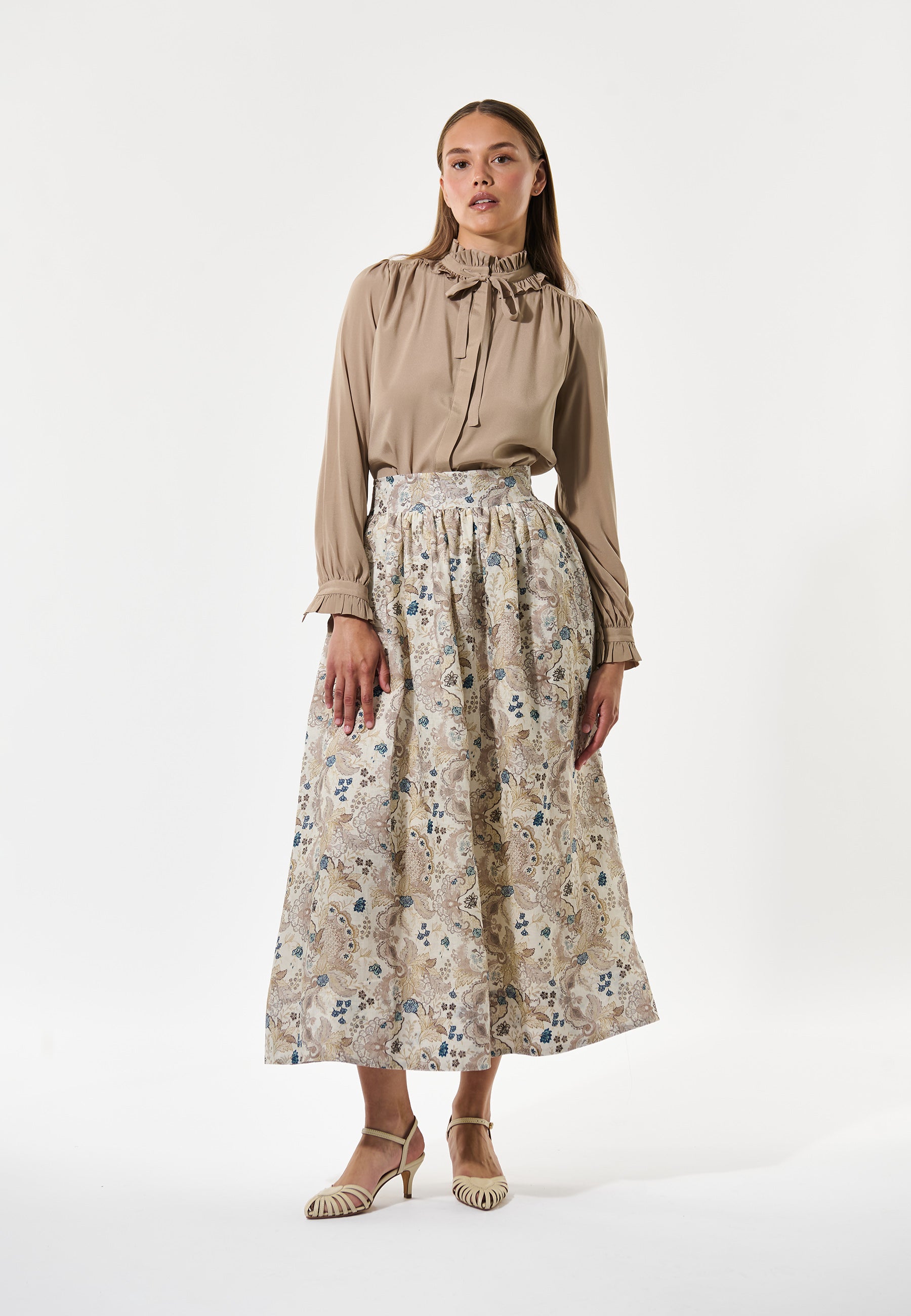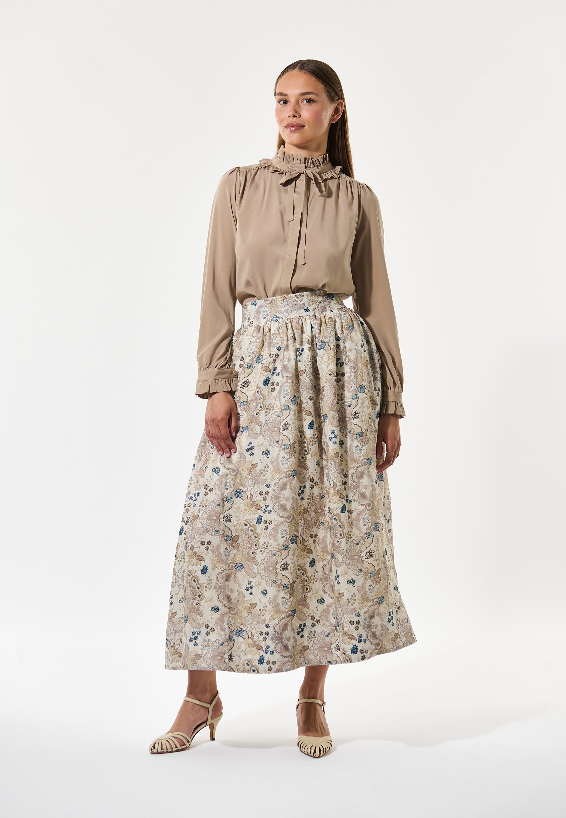 Smuk silkeskjorte med feminine detaljer. Skjorten med skjultknaplukning har flæsekrave med bindebånd, ærme med puf, samt rynk og flæse ved håndledet.