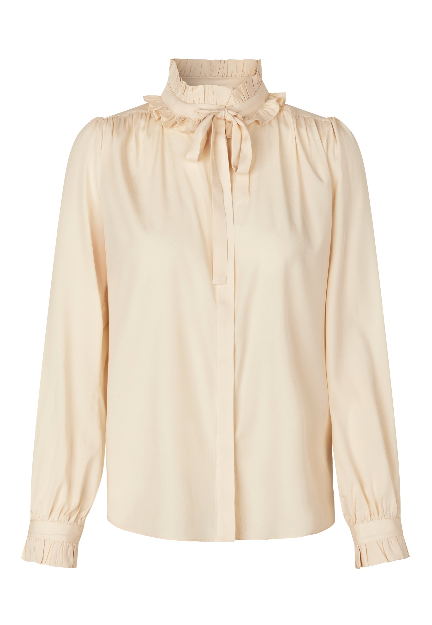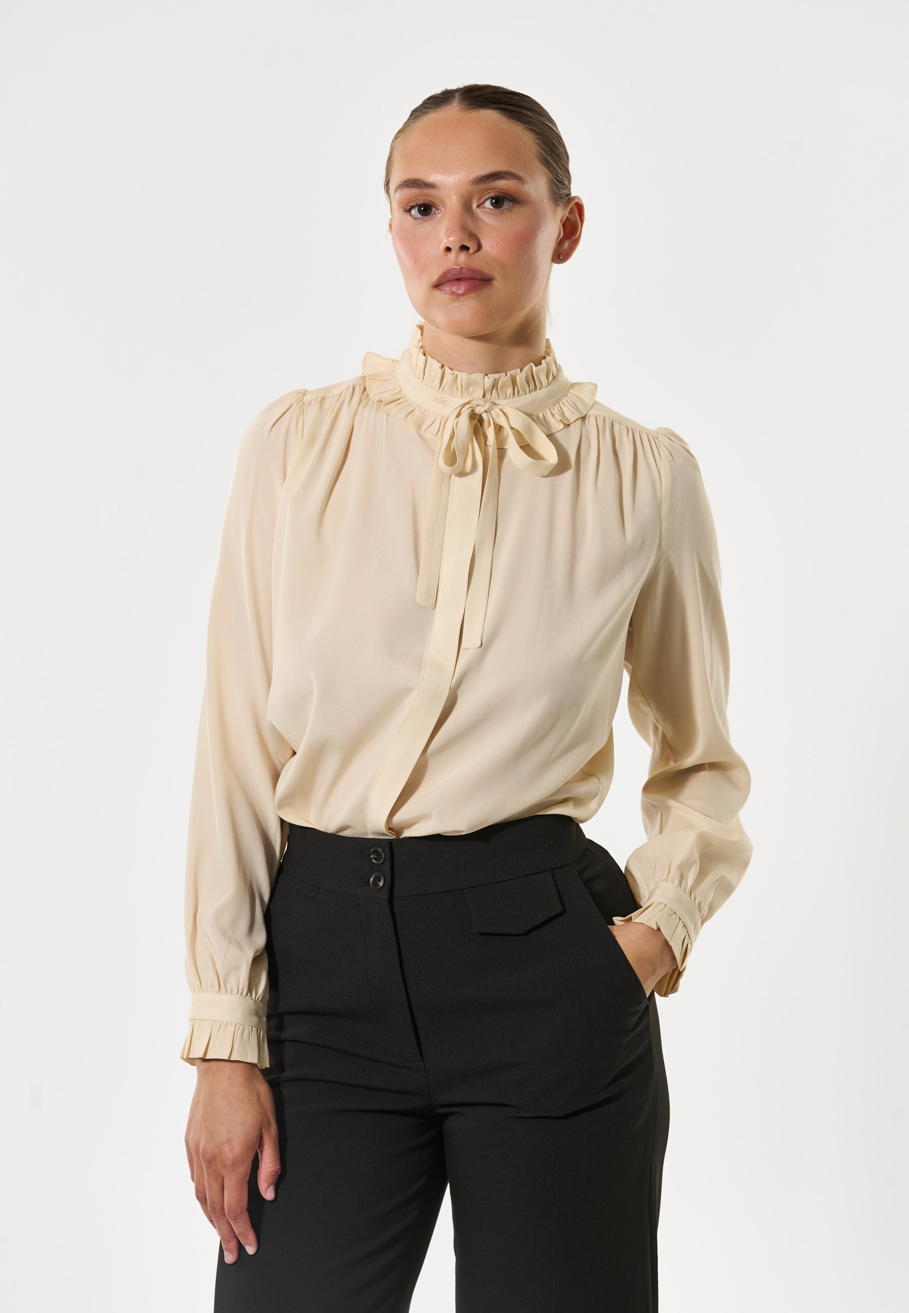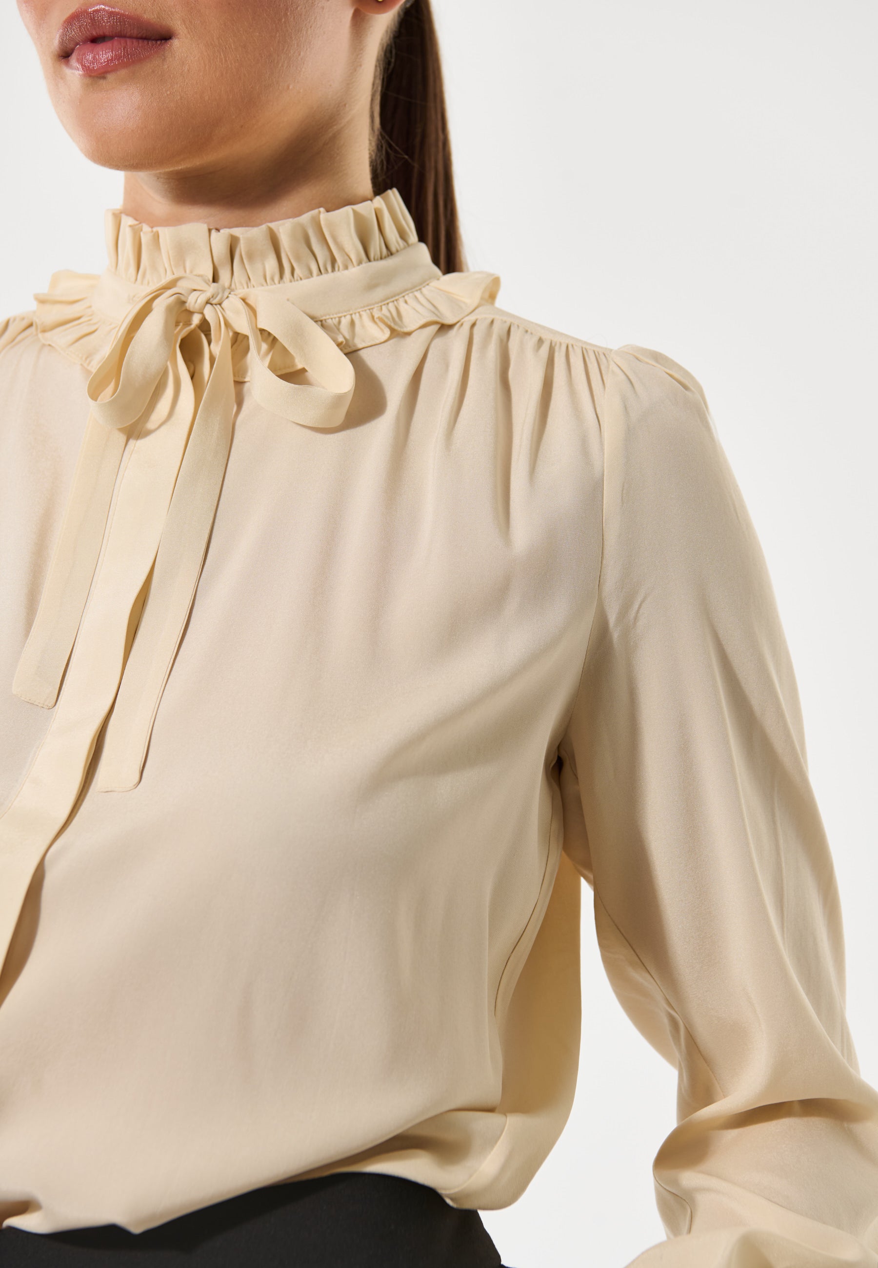 Smuk silkeskjorte med feminine detaljer. Skjorten med skjultknaplukning har flæsekrave med bindebånd, ærme med puf, samt rynk og flæse ved håndledet.