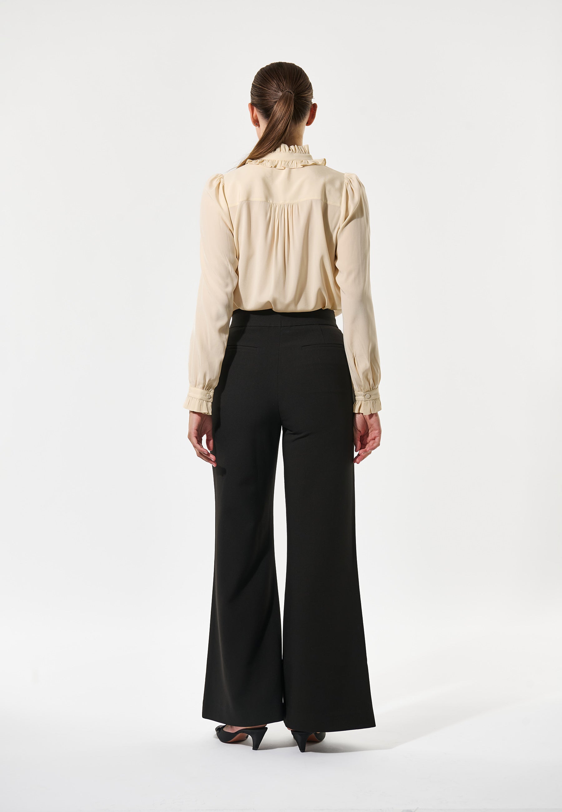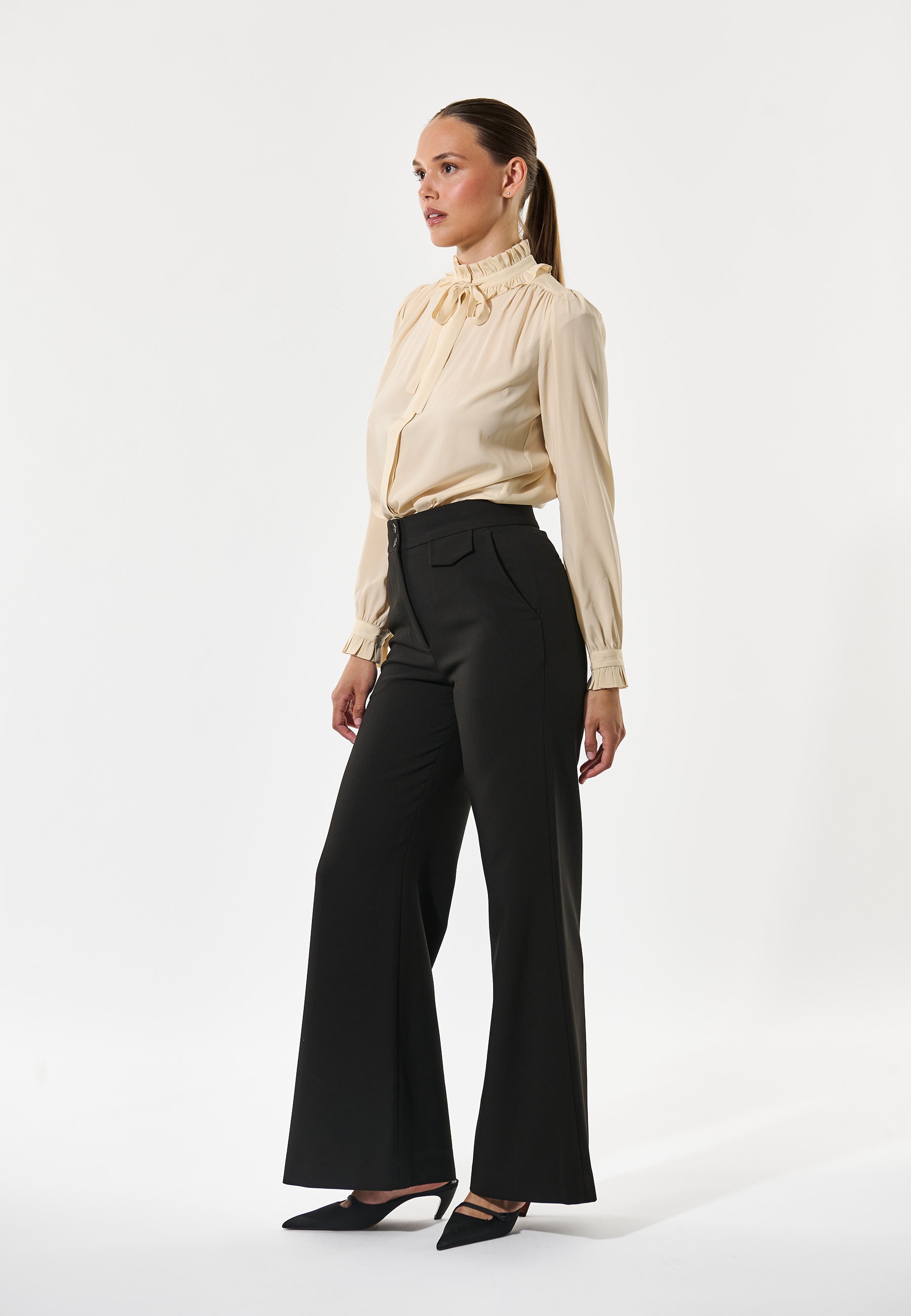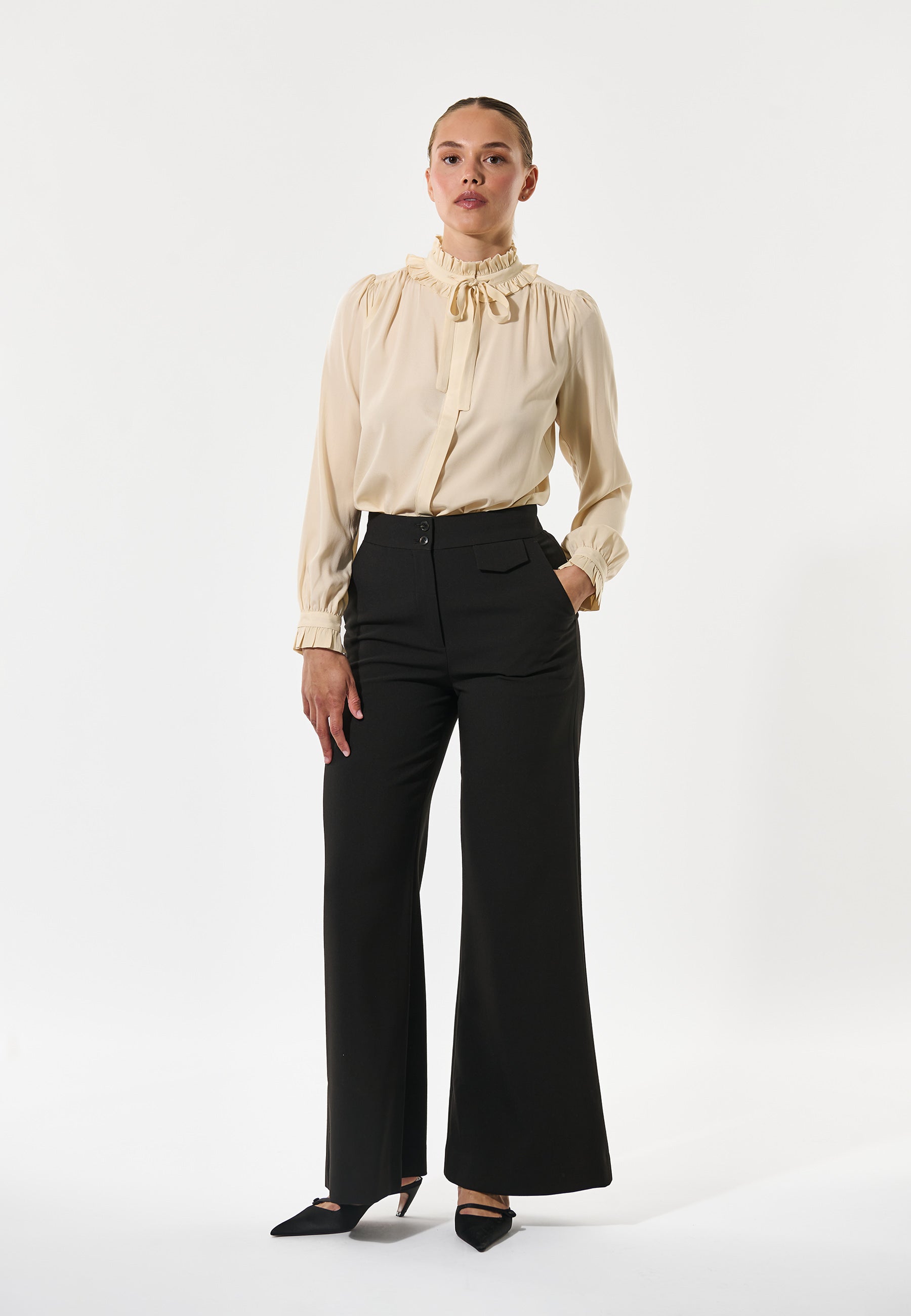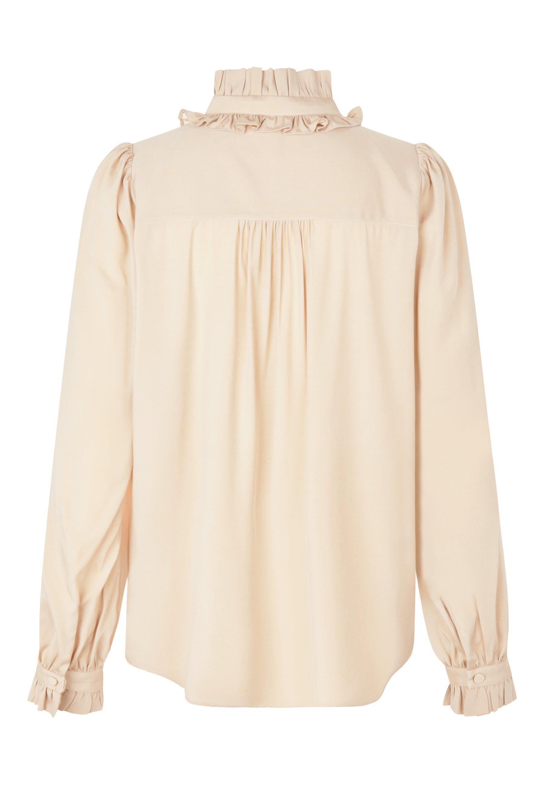 Smuk silkeskjorte med feminine detaljer. Skjorten med skjultknaplukning har flæsekrave med bindebånd, ærme med puf, samt rynk og flæse ved håndledet.