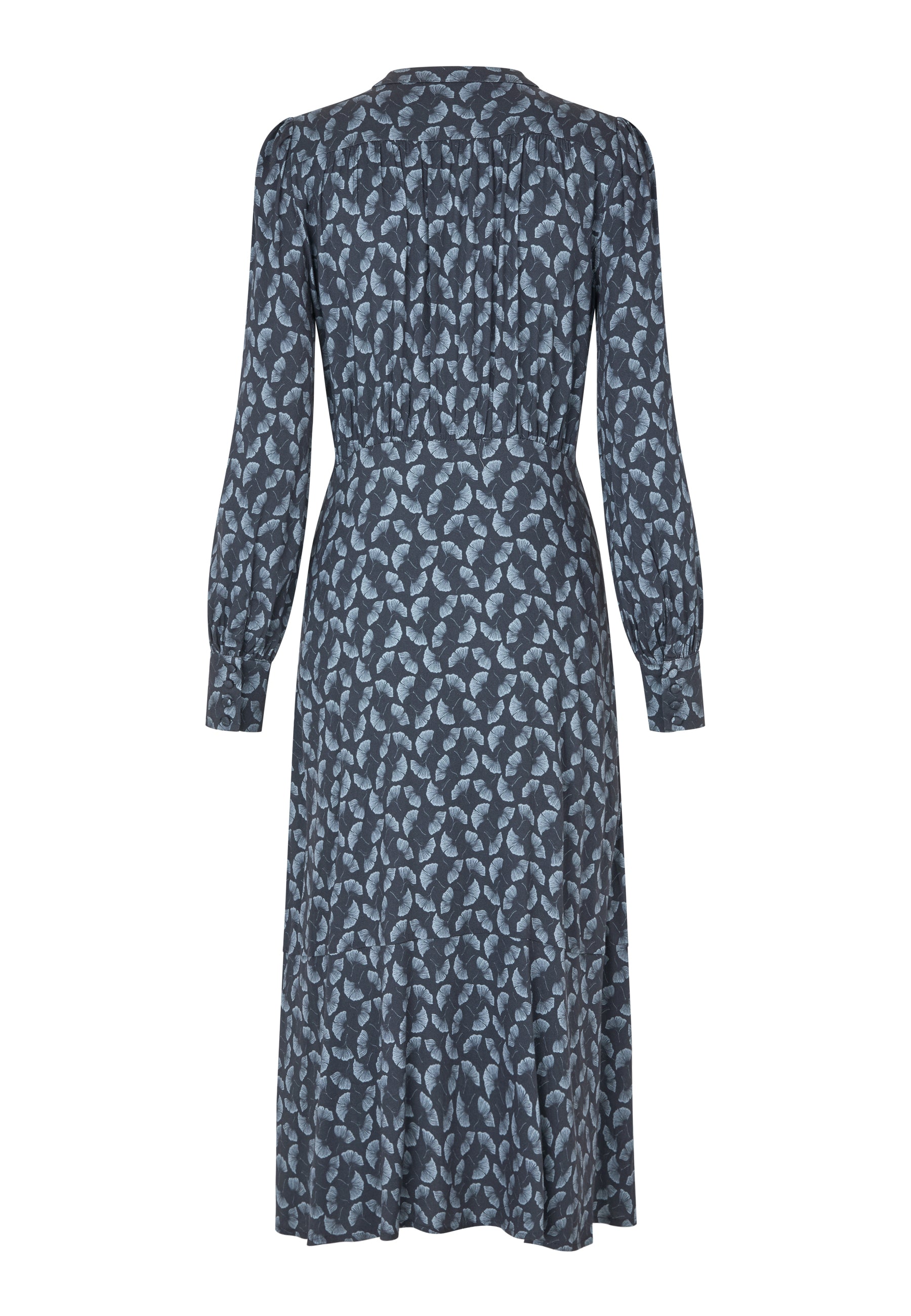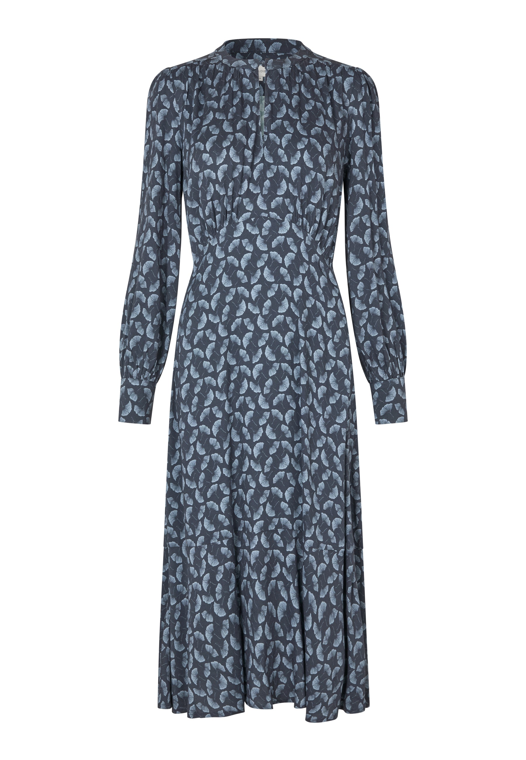 Skøn viscosekjole i blåt grafisk print. Kjolen har empire-overskæring med små rynk, skulderbærestykke ligeledes med rynk, samt løse ærmer med lille puf og manchet som lukkes med fine betrukne knapper. Bagpå er ligeledes en overskæring med små rynk, som fremhæver lænden på en meget feminin måde, nederst er et bredt flæsestykke. Kjolen kan enten lukkes med en lille knap i halsen eller stå åben hvis du ønsker en V-udskæring.