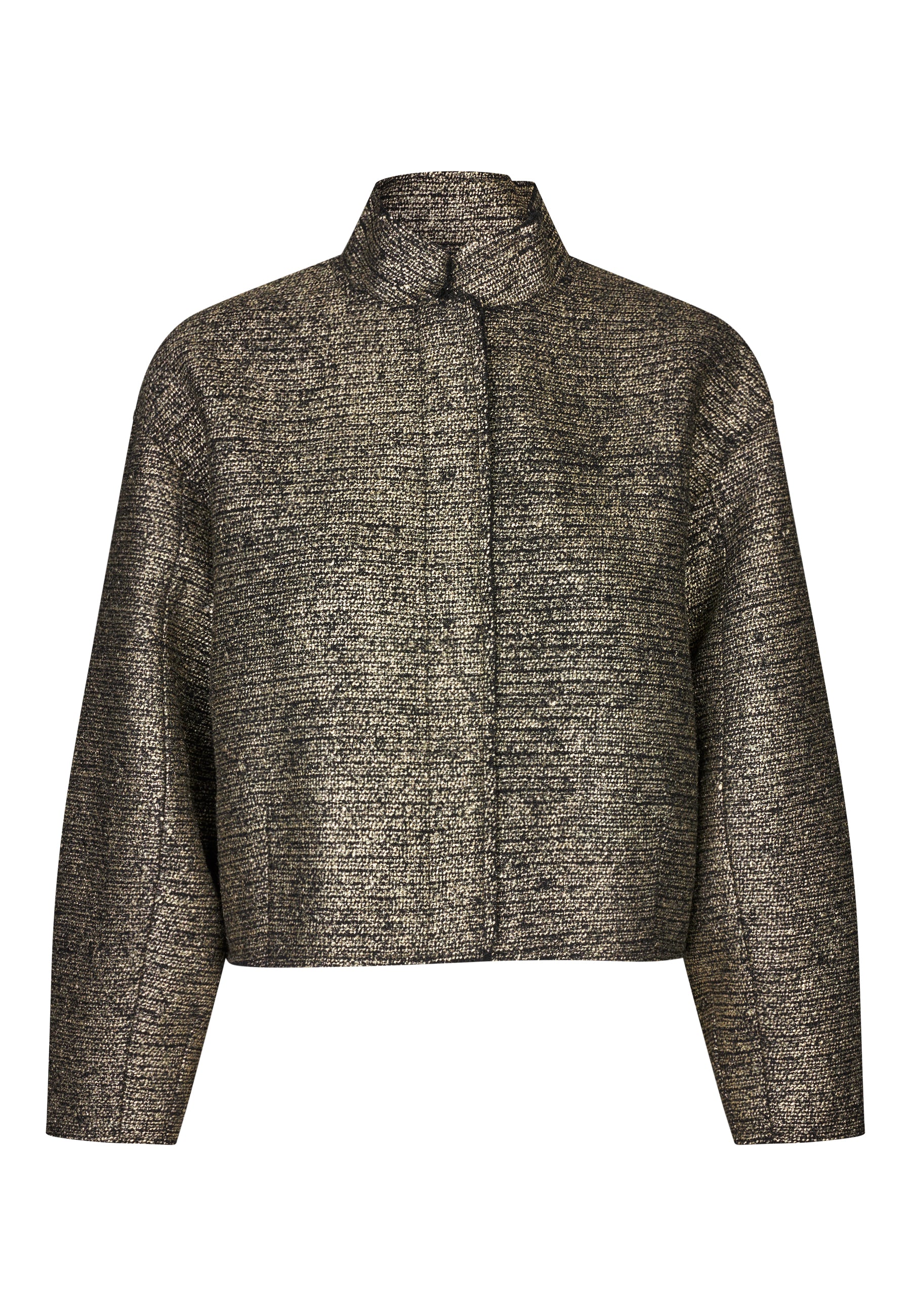 Kort jakke i et enkelt snit, med kinakrave, tryklås lukning og volumiøse ærmer som snævre ind ved håndleddet.