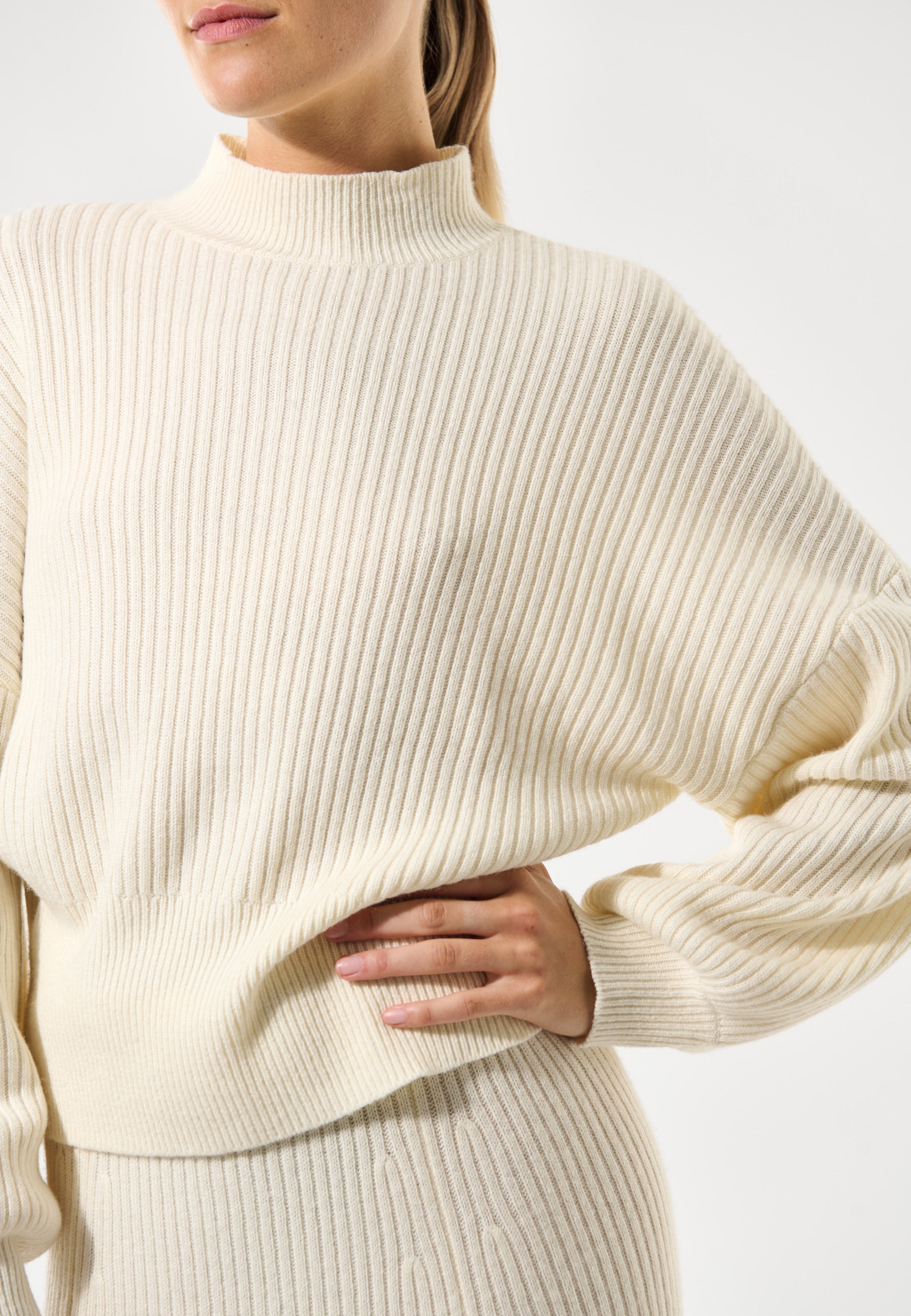 Strikbluse i et bred fit med turtleneck, ærmer med vidde og rib manchet.