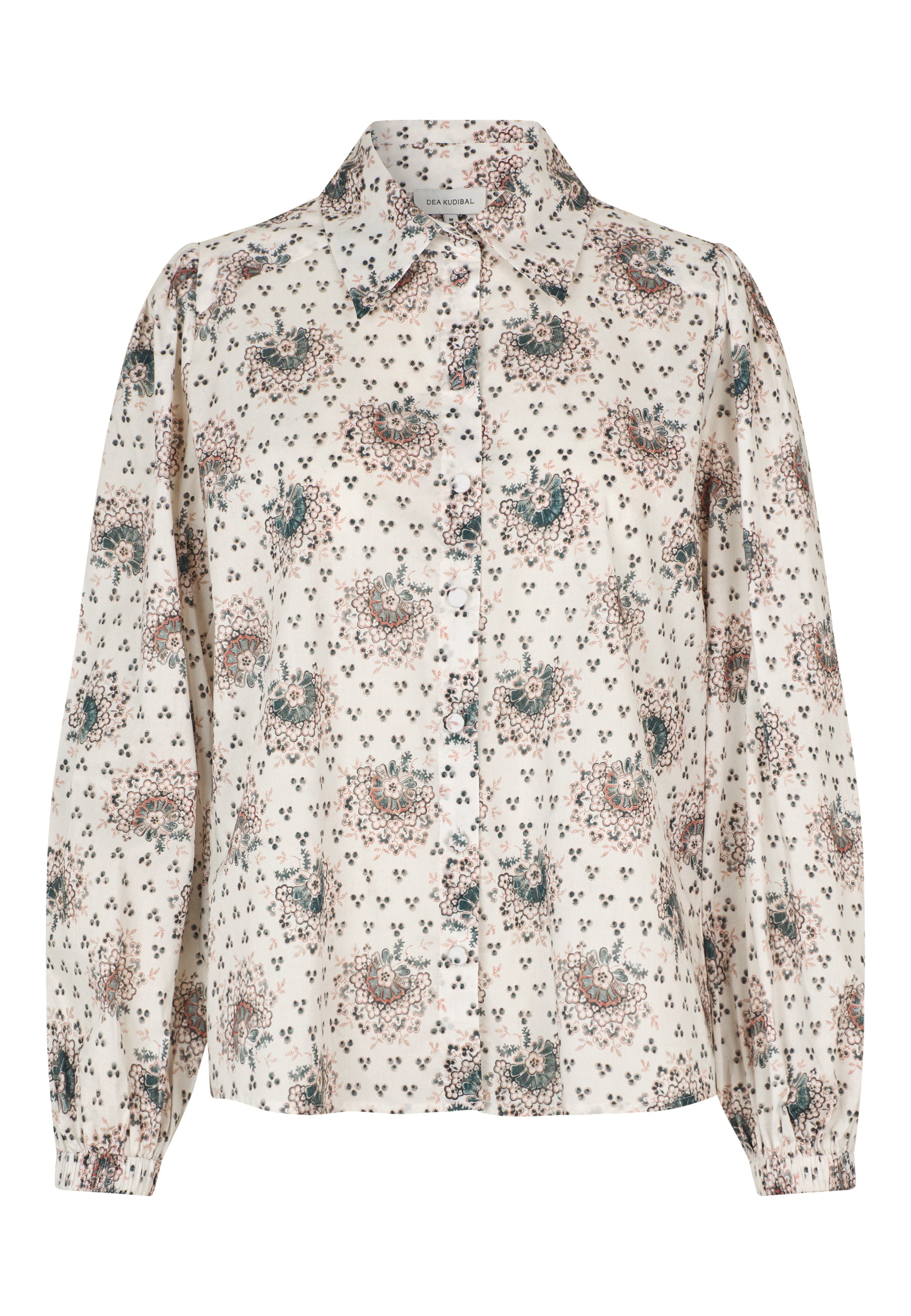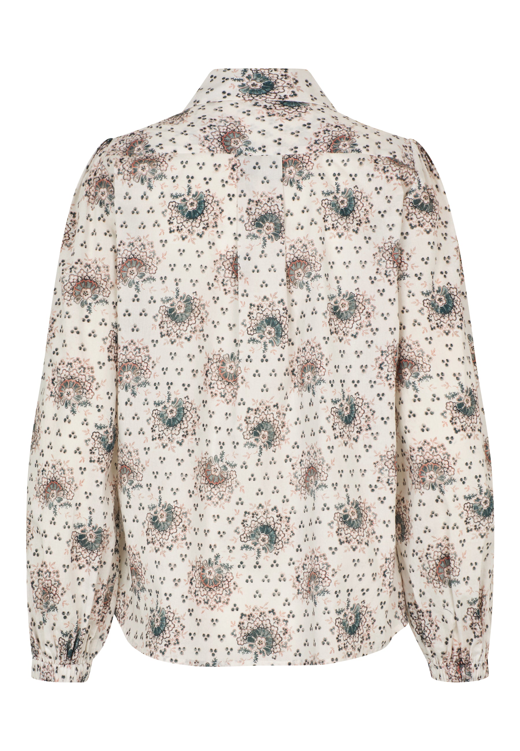 Smuk bomuldskjorte med et skønt 70ér inspireret print. Skjorten har krave, klassisk bærestykke på skulderen, brede ærmer med elastikmanchet og fine betrukne knapper.