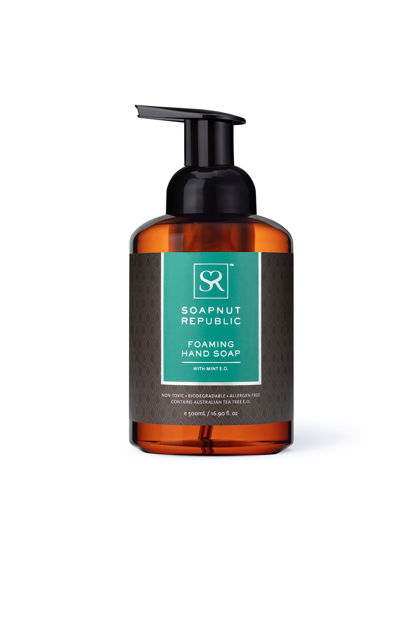 Den naturligt beroligende og afkølende virkning af essentiel olie med pebermynte og dens antioxidantegenskaber kombineres med ren Soapnut ekstrakt for at skabe en luksuriøs skummende håndsæbe, der naturligt er allergivenlig og skånsom mod huden.