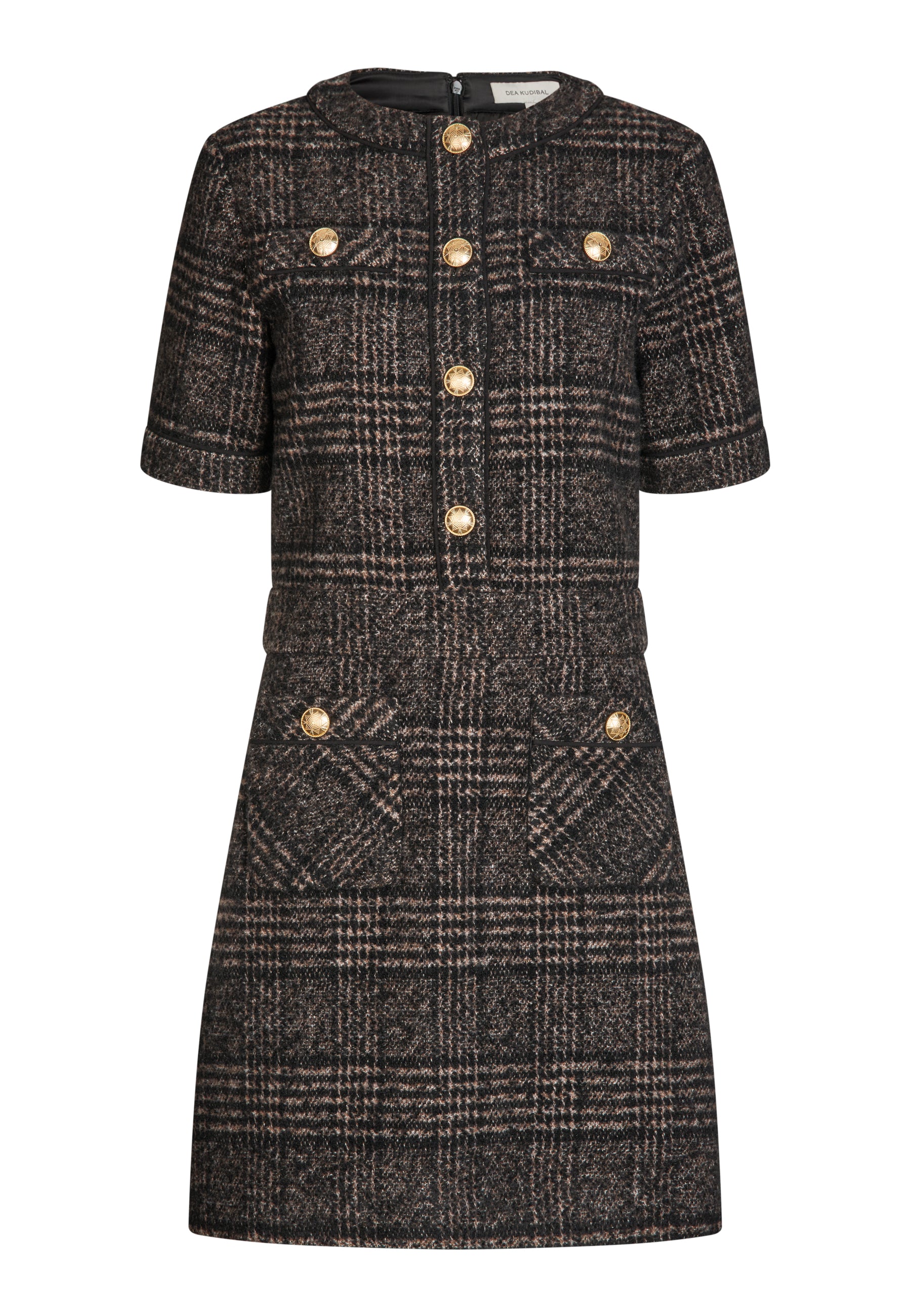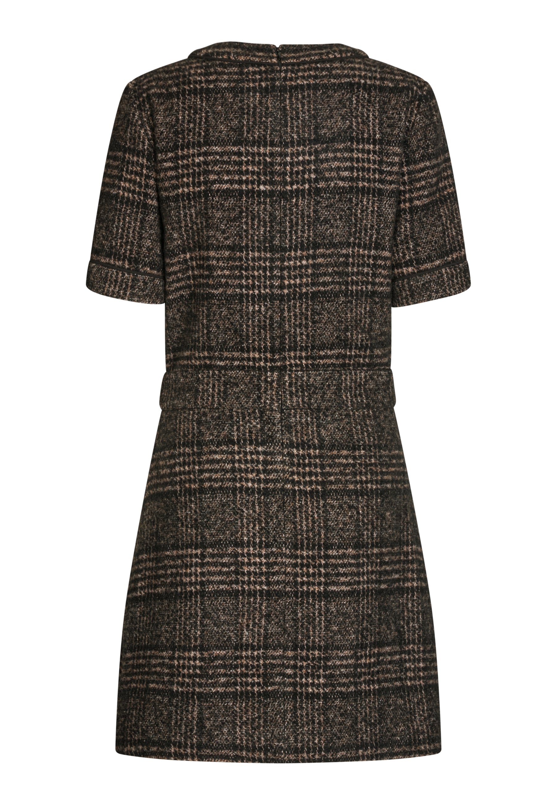 Skøn 60ér inspireret kjole i ternet uldblanding. Kjolen har overskæring/linning i taljen, påsyede lommer, kort ærme og gyldne knapper. Style den med tykke strømper, en langærmet silkeskjorte eller t-shirt under, og støvler for et cool hverdags vinterlook eller med tynde strømper og høje hæle for et lækkert festlook.