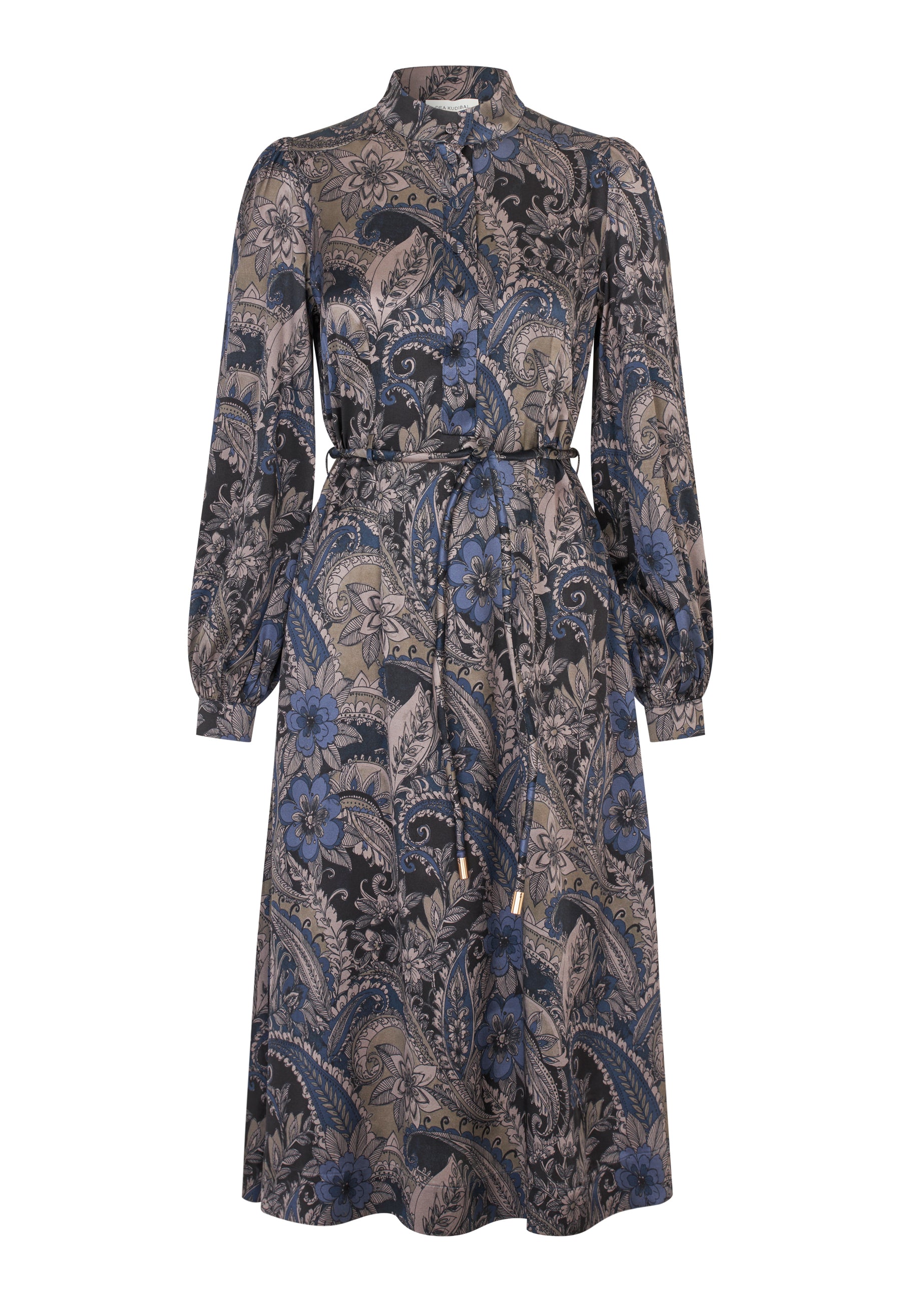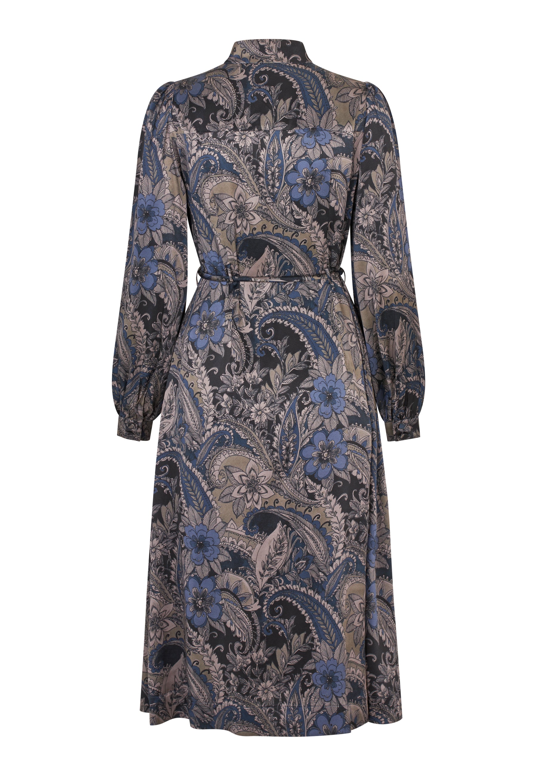 Elegant silkekjole med kinakrave, knaplukning på den øverste halvdel samt ærme med puf og manchet. Kjolen har overskæring i taljen, som understeges med et tyndt bælte kjolens materiale. Printet er et paisley i smukke sort blå og beige nuancer.