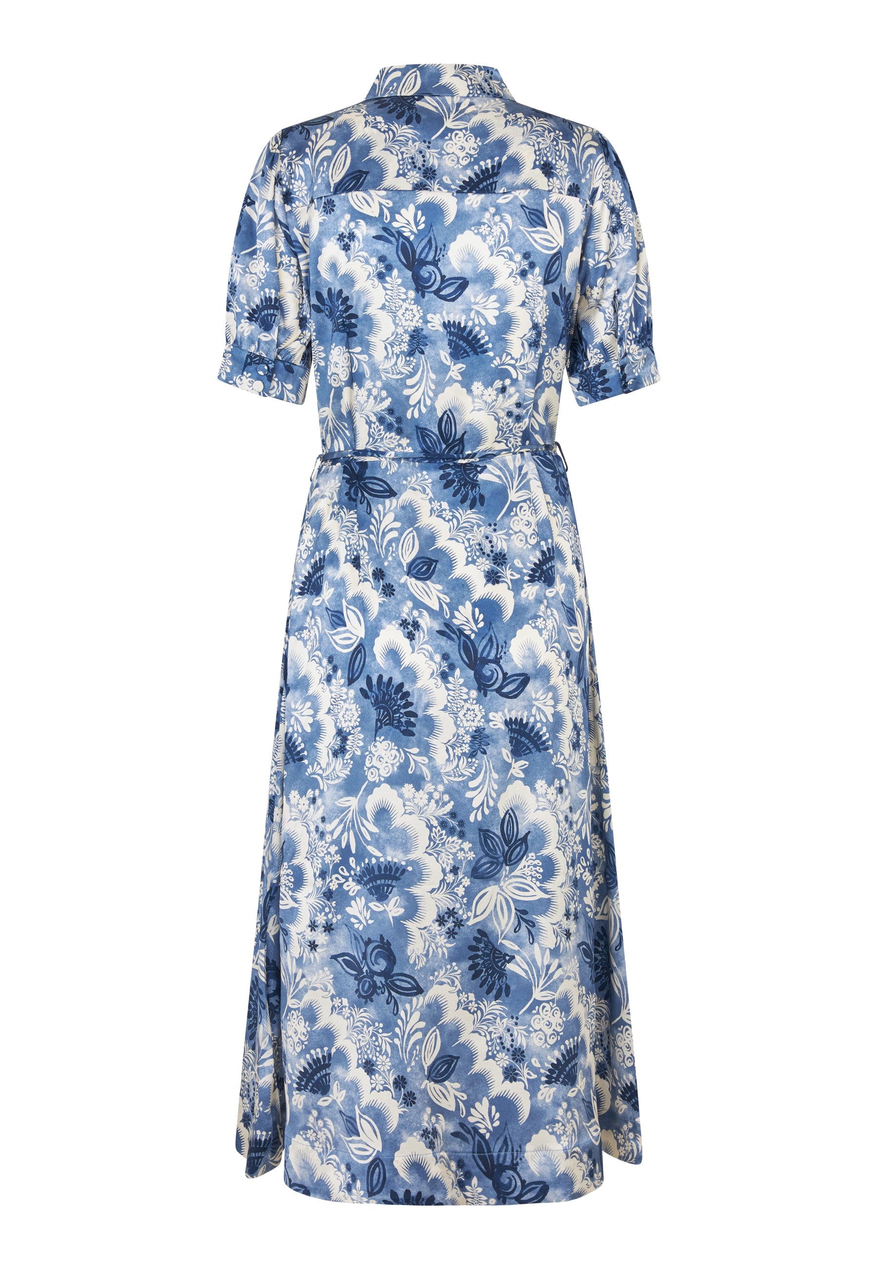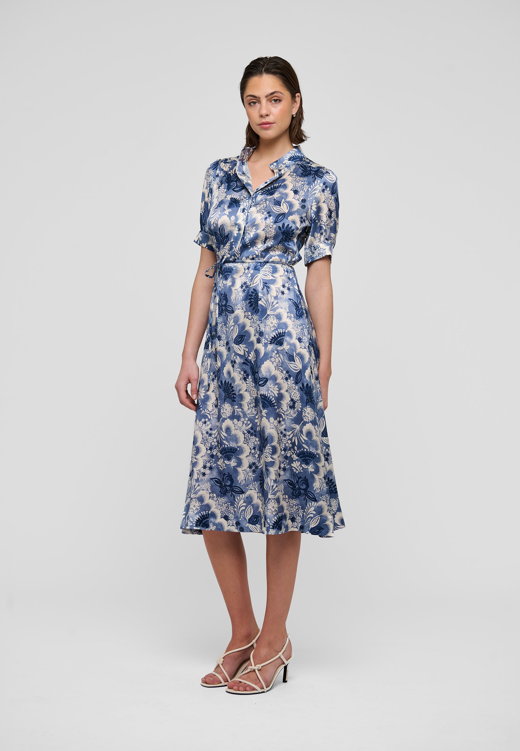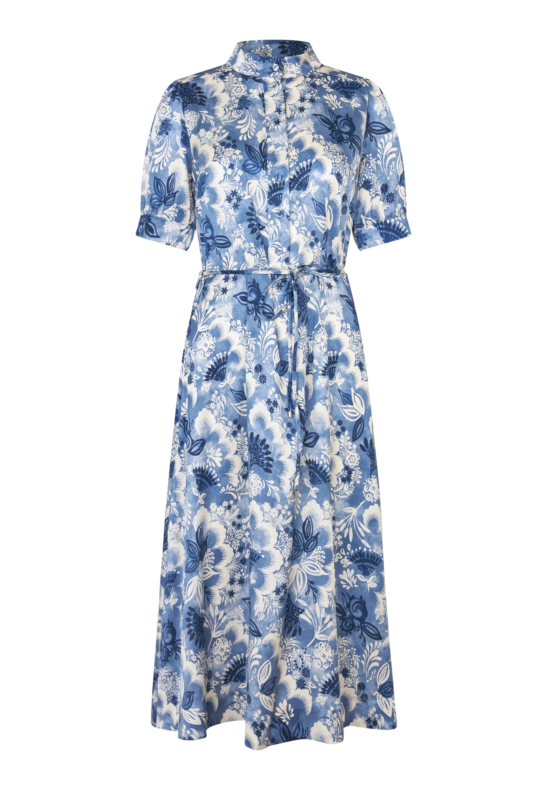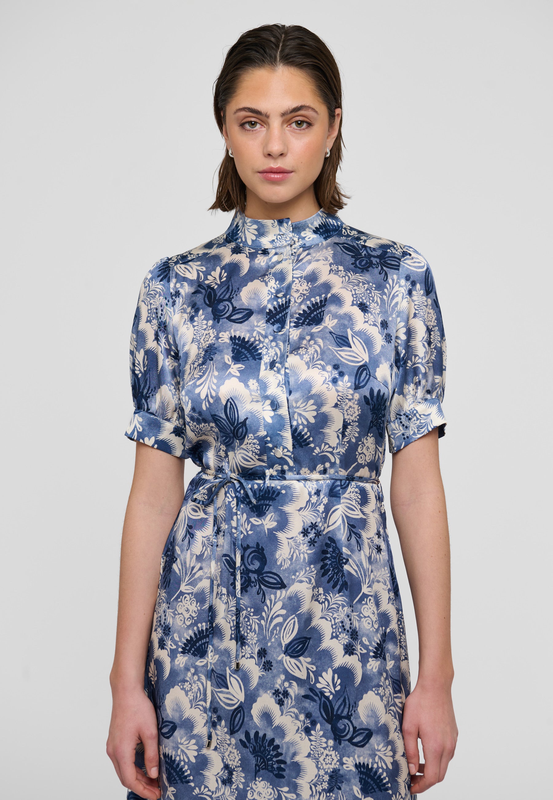 Klassisk elegant silkekjole med kinakrave, fine betrukne knapper på den øverste del, ærme med puf og manchet, samt en overskæring i taljen, som understeges med et tyndt bælte i kjolens materiale.