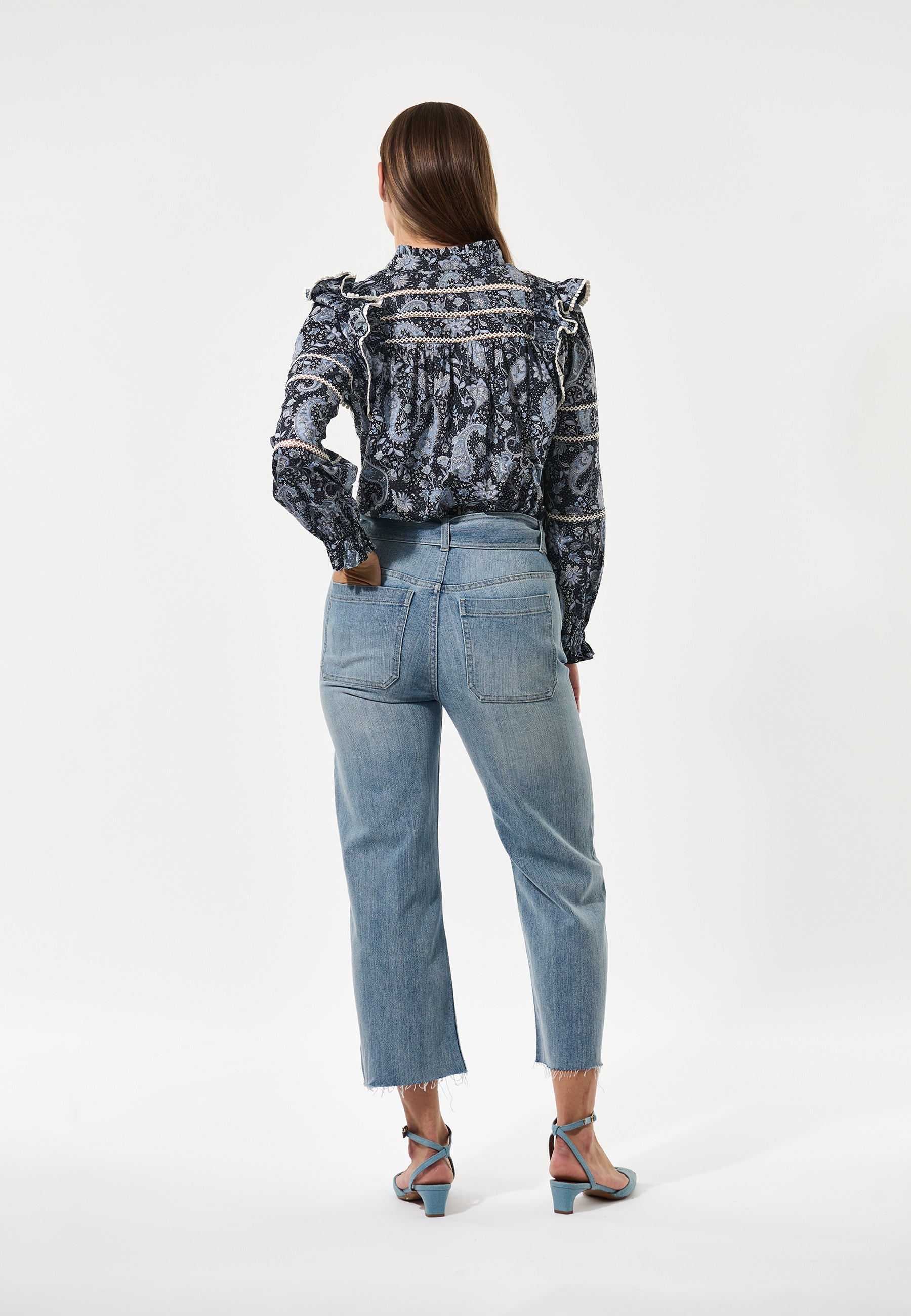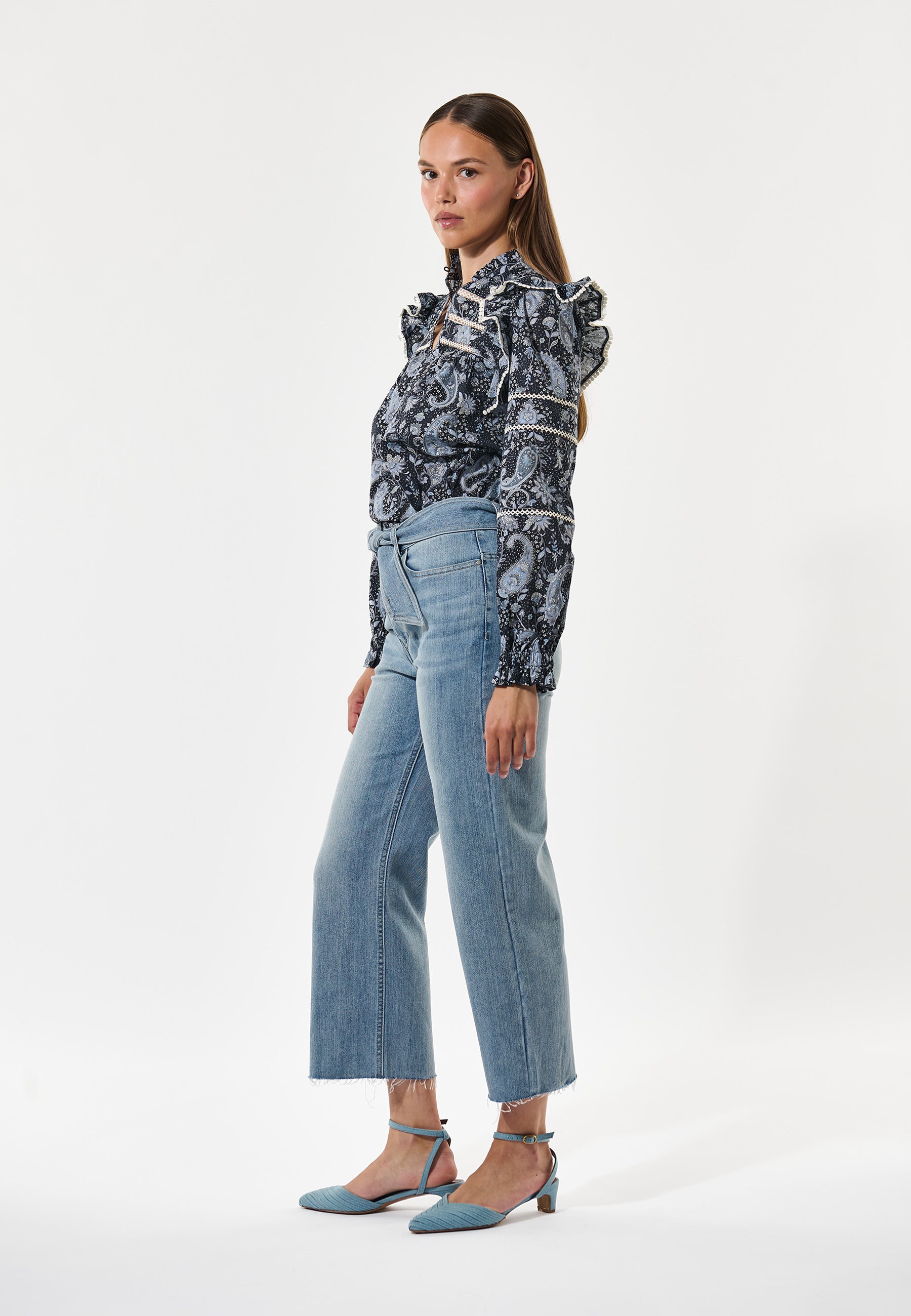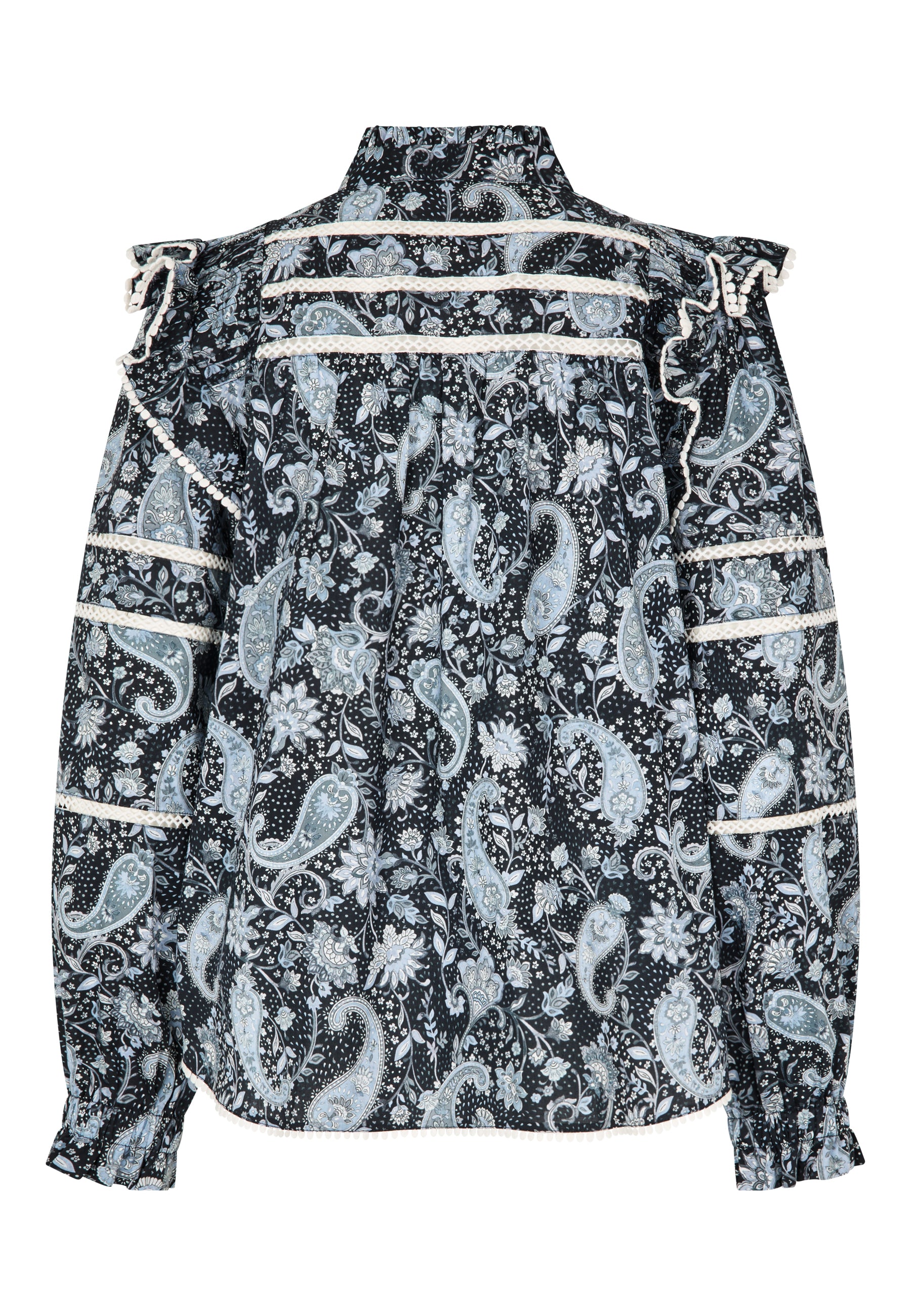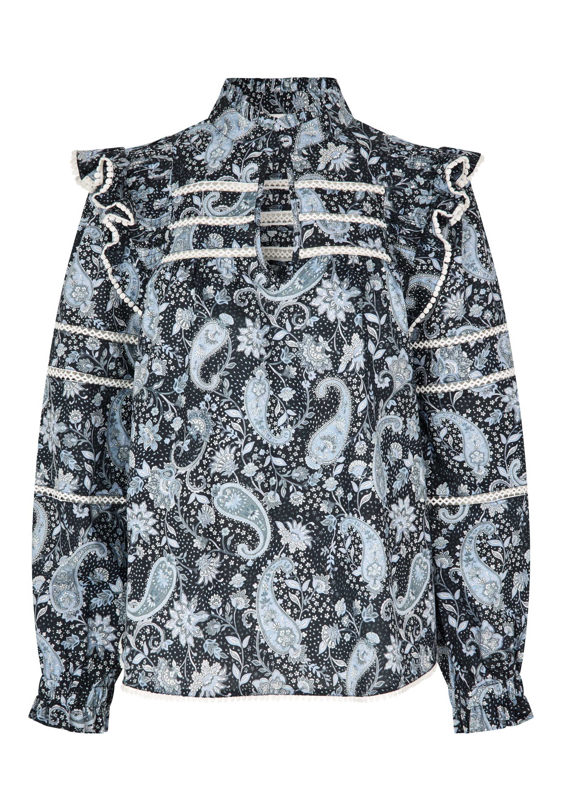 Skøn bomulds tunika i løst snit, med indsatte knipling detaljer, har løse ærmer med elastik/flæse manchet og er i et skønt paisley print bestående af sort, hvid, lyseblå og grå.