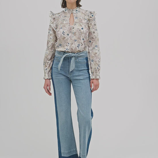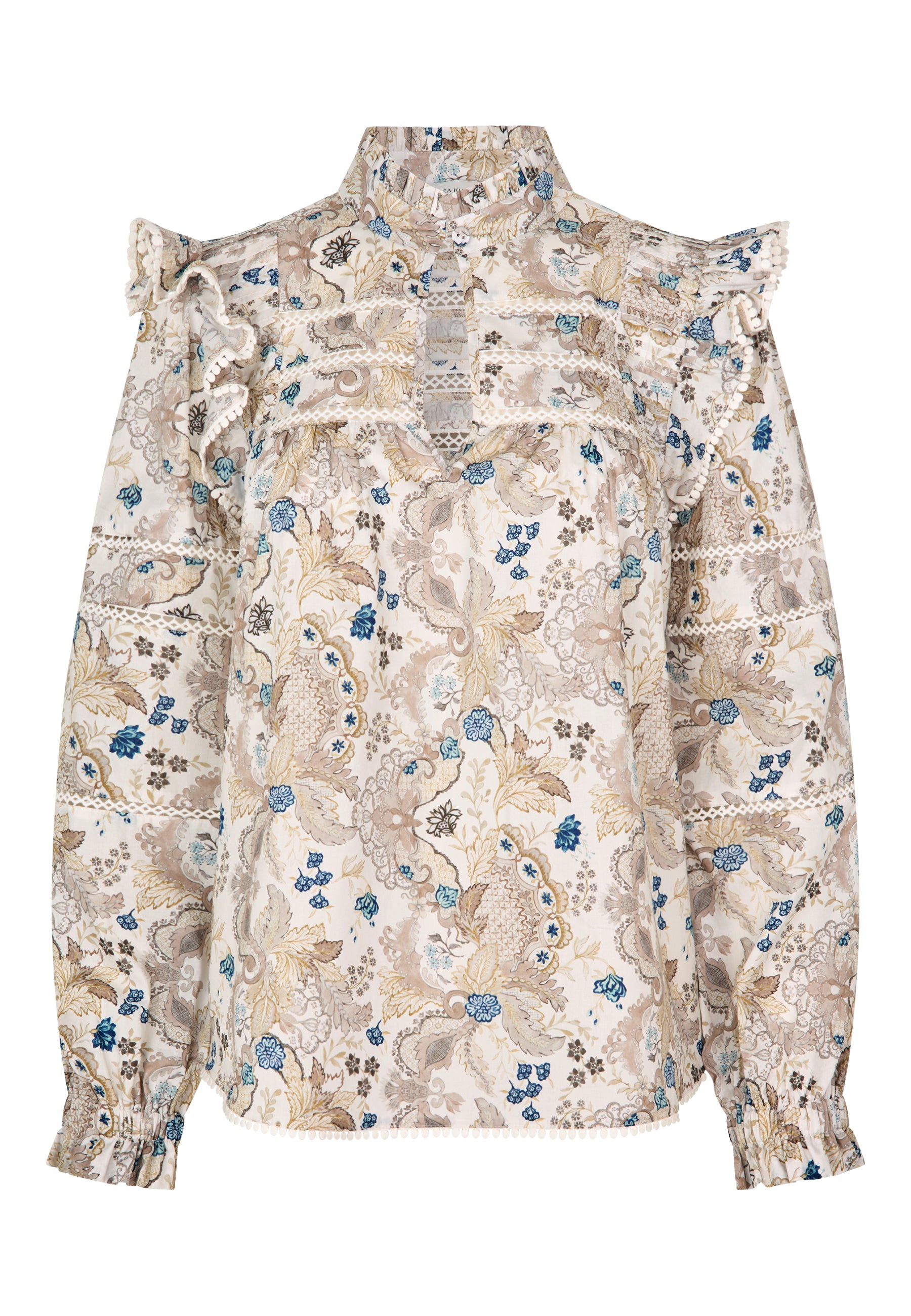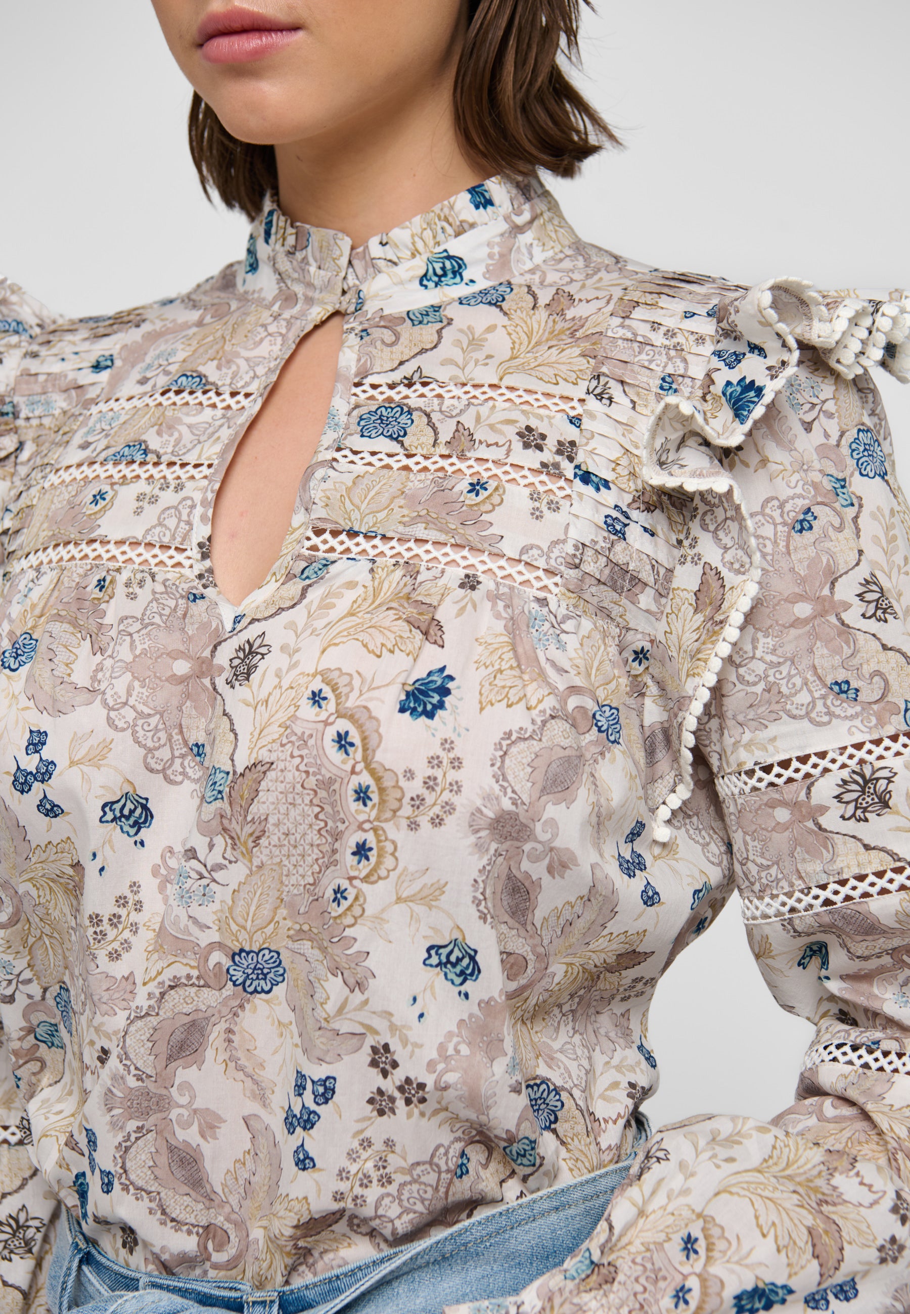 Skøn bomulds tunika i løst snit, med indsatte knipling detaljer, har løse ærmer med elastik/flæse manchet. Tunikaen er i et delikat feminint print i creme nuancer tilsat lidt kontrast i form af små blå blomster.