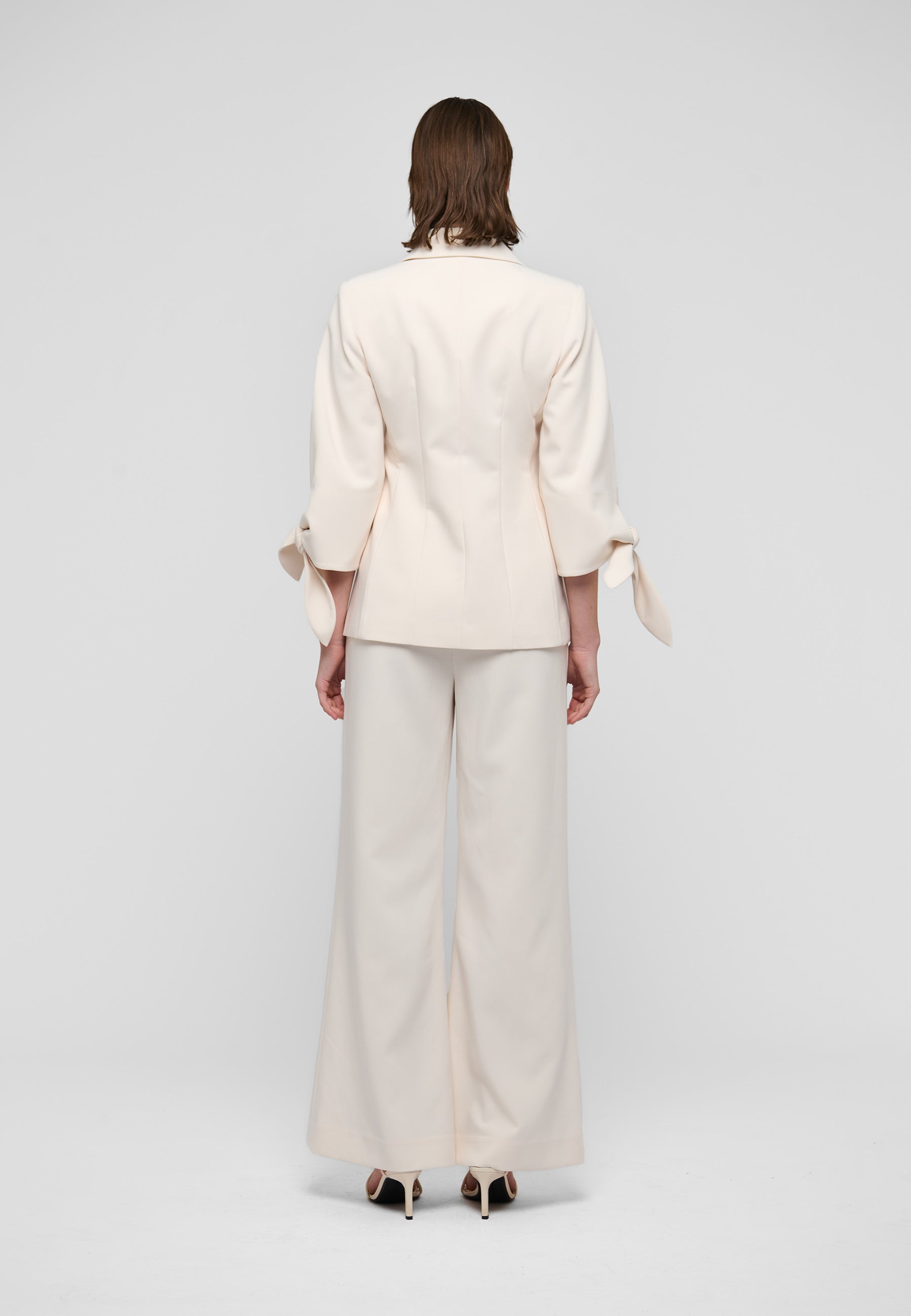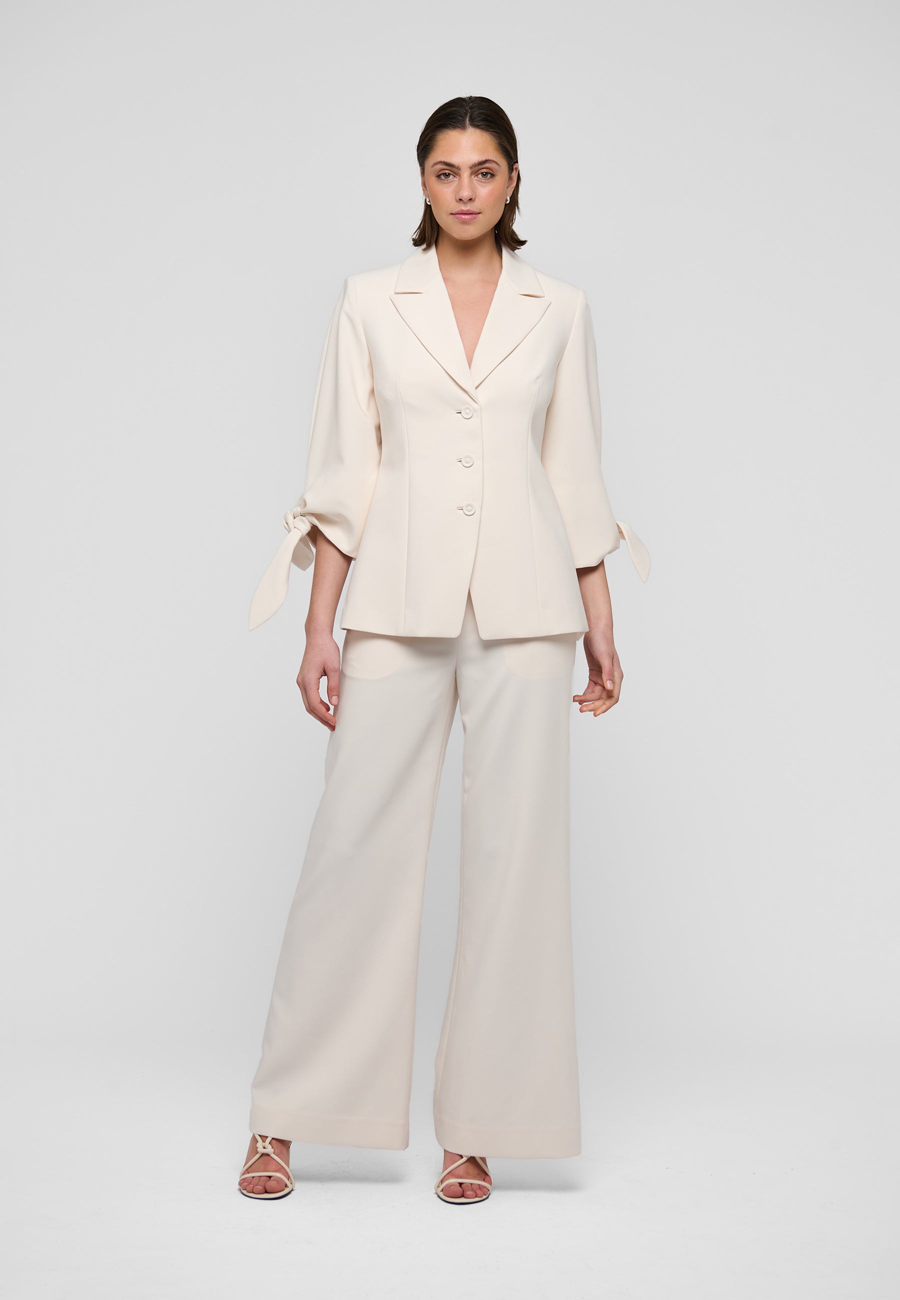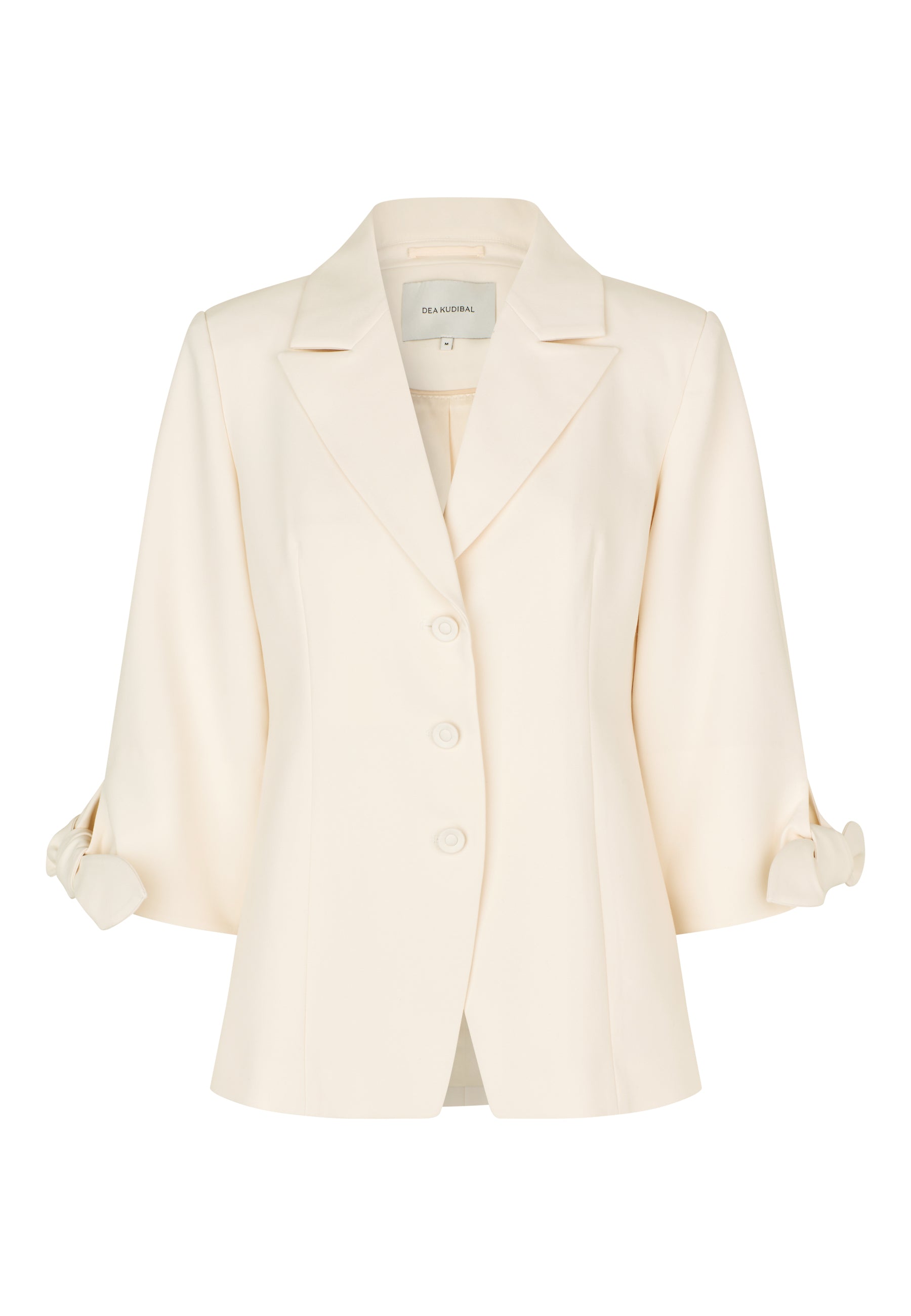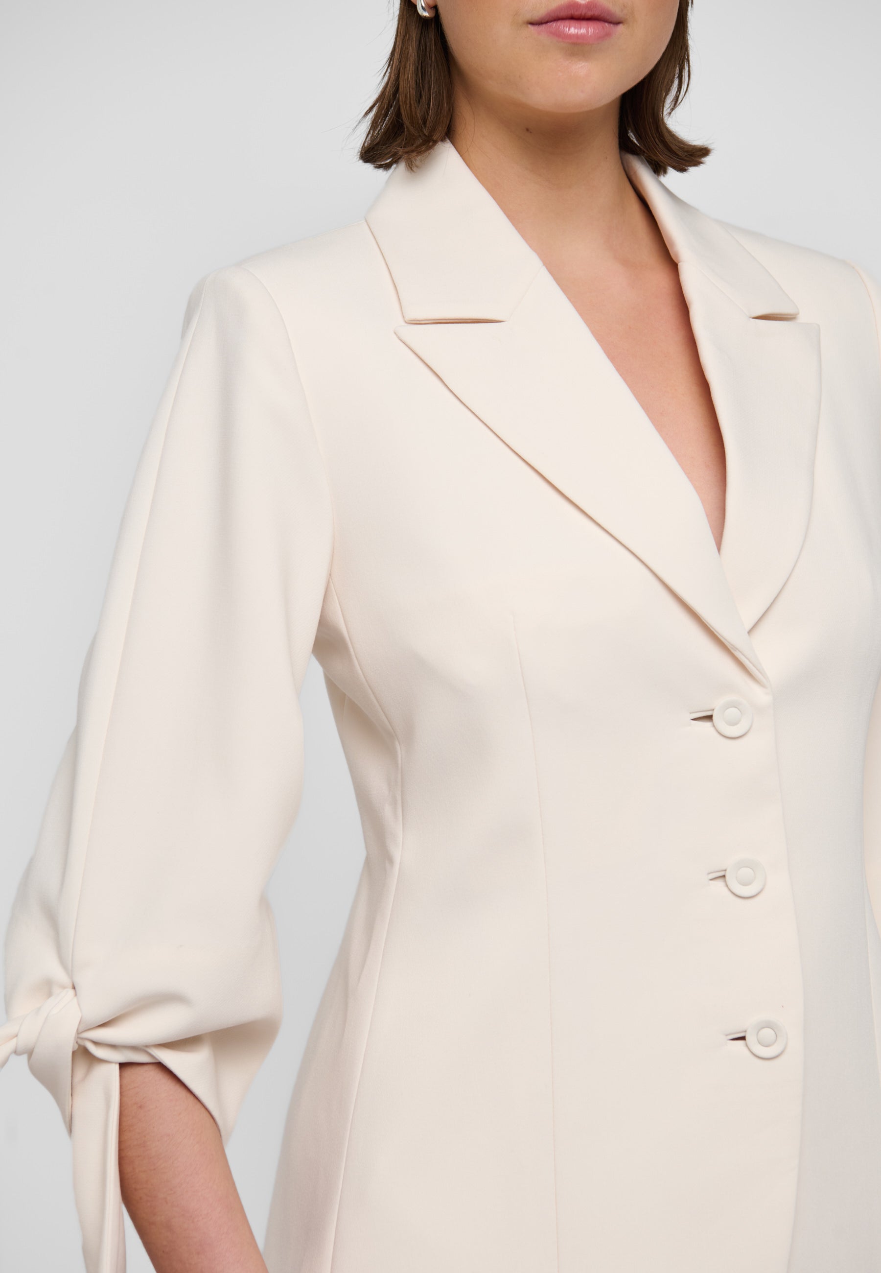 Skøn blazer med betrukne knapper og feminin binde detalje på de 3/4 lange ærmer.