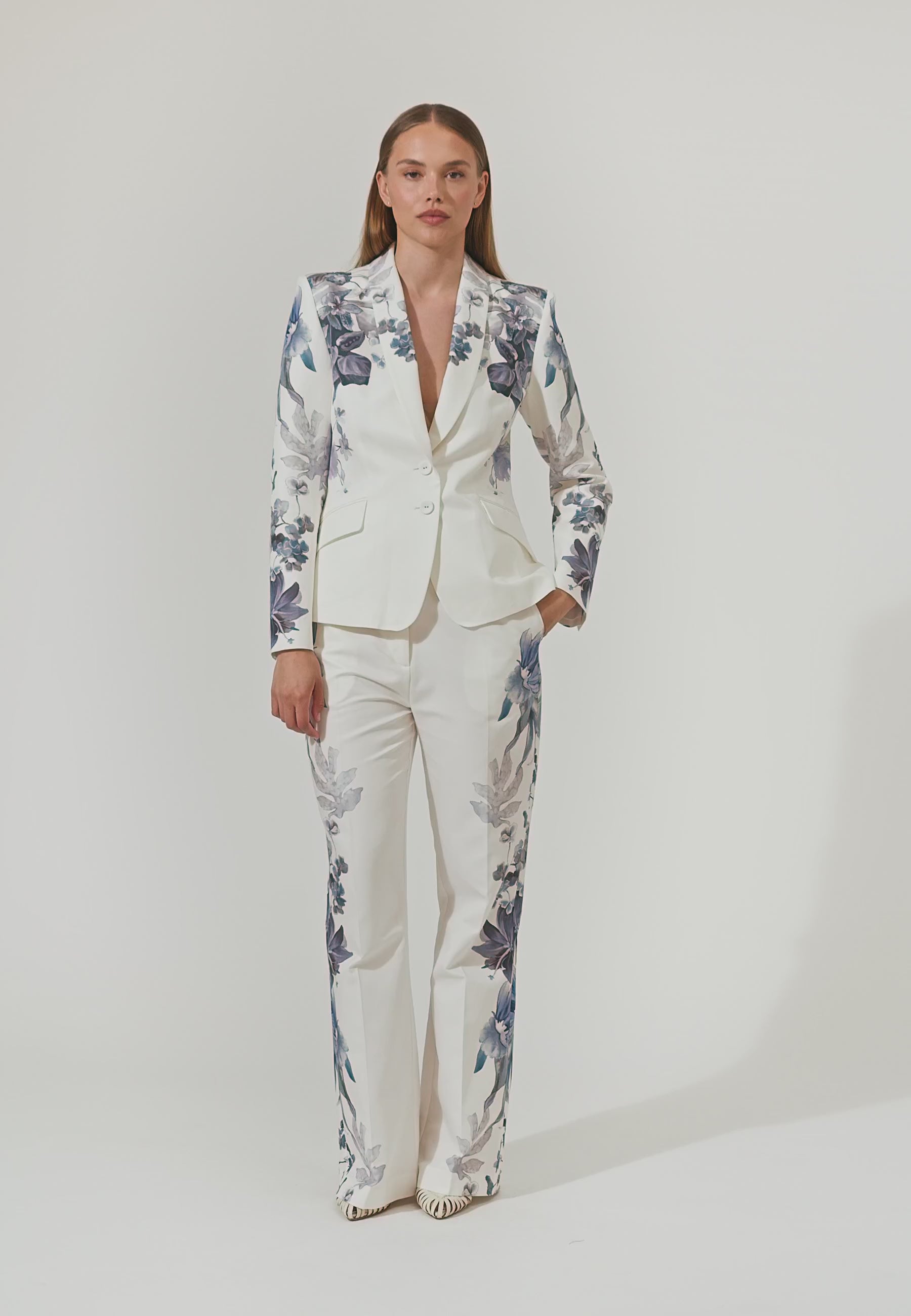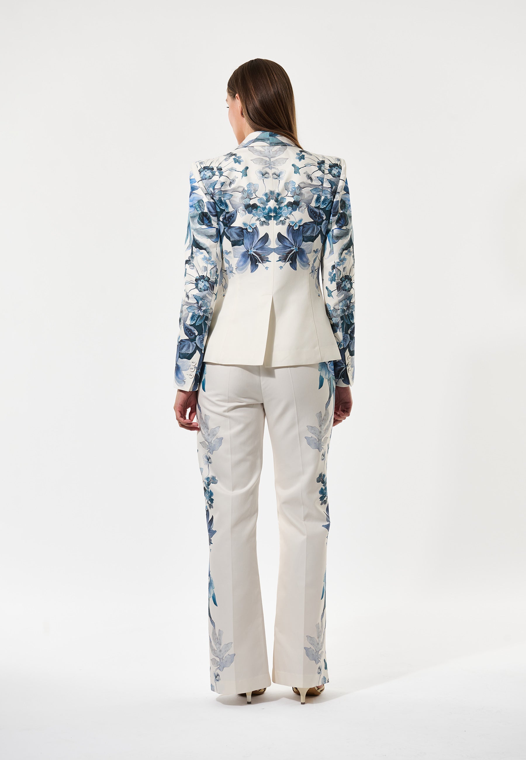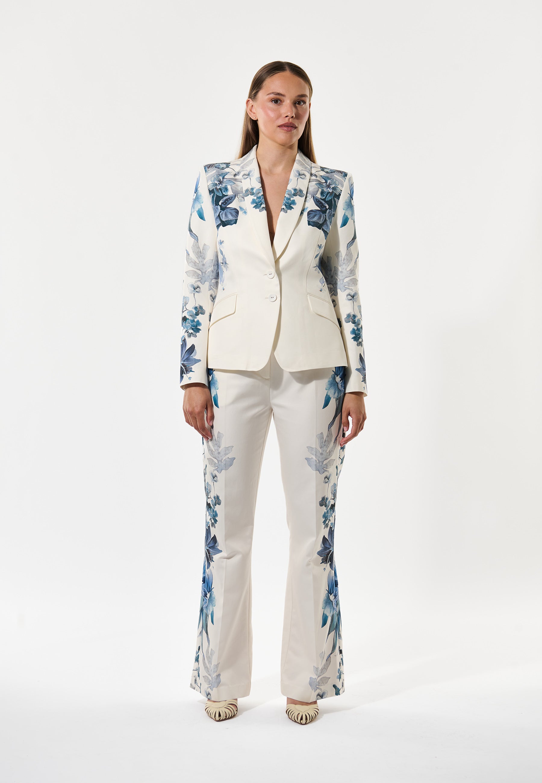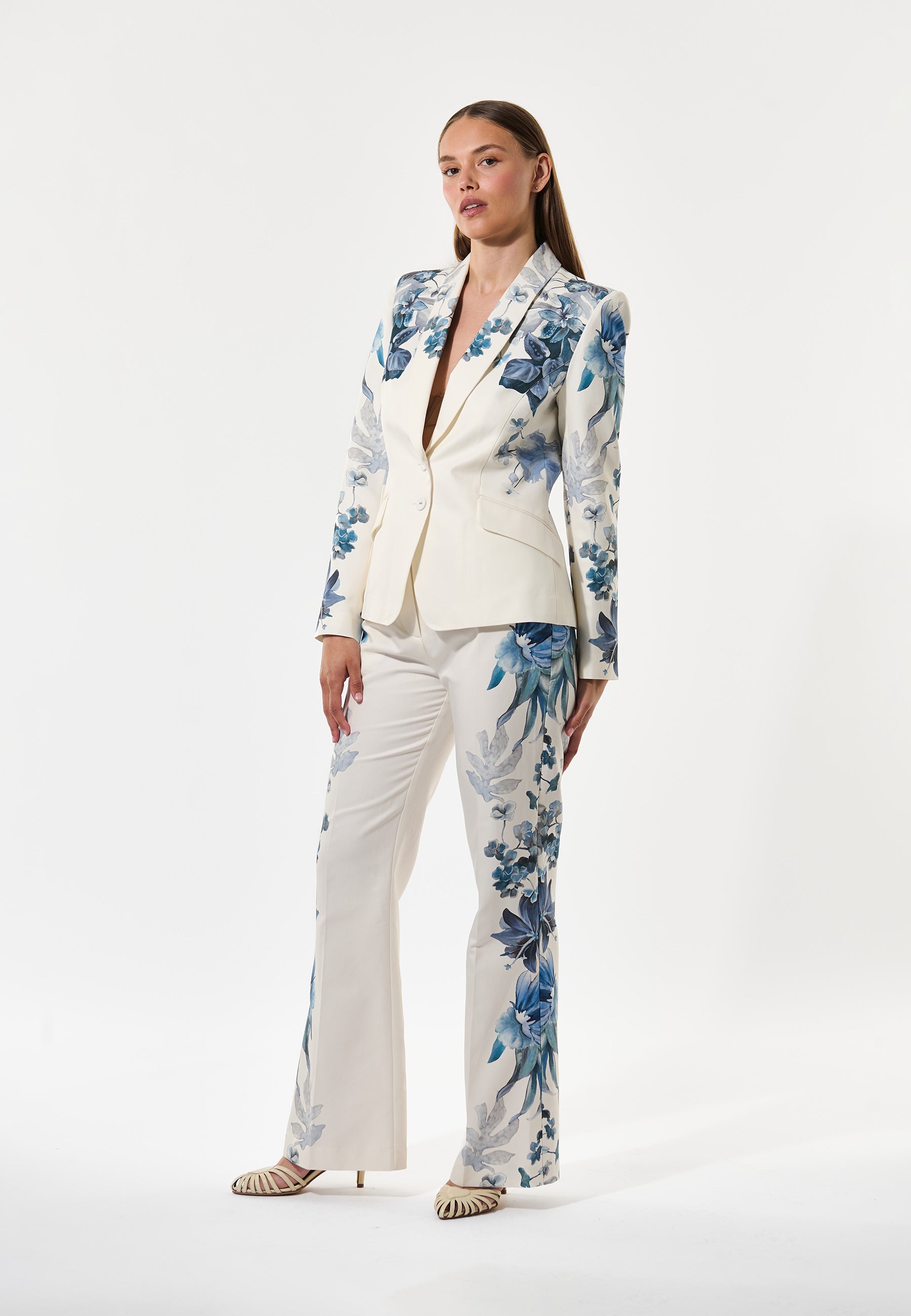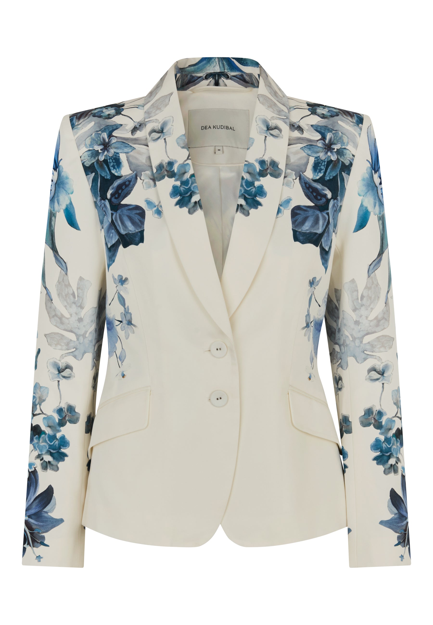 Skøn blazer med smukt blomster placement-print. Blazeren har klassisk sjalskrave, lommer med klap og 2 knaps lukning.