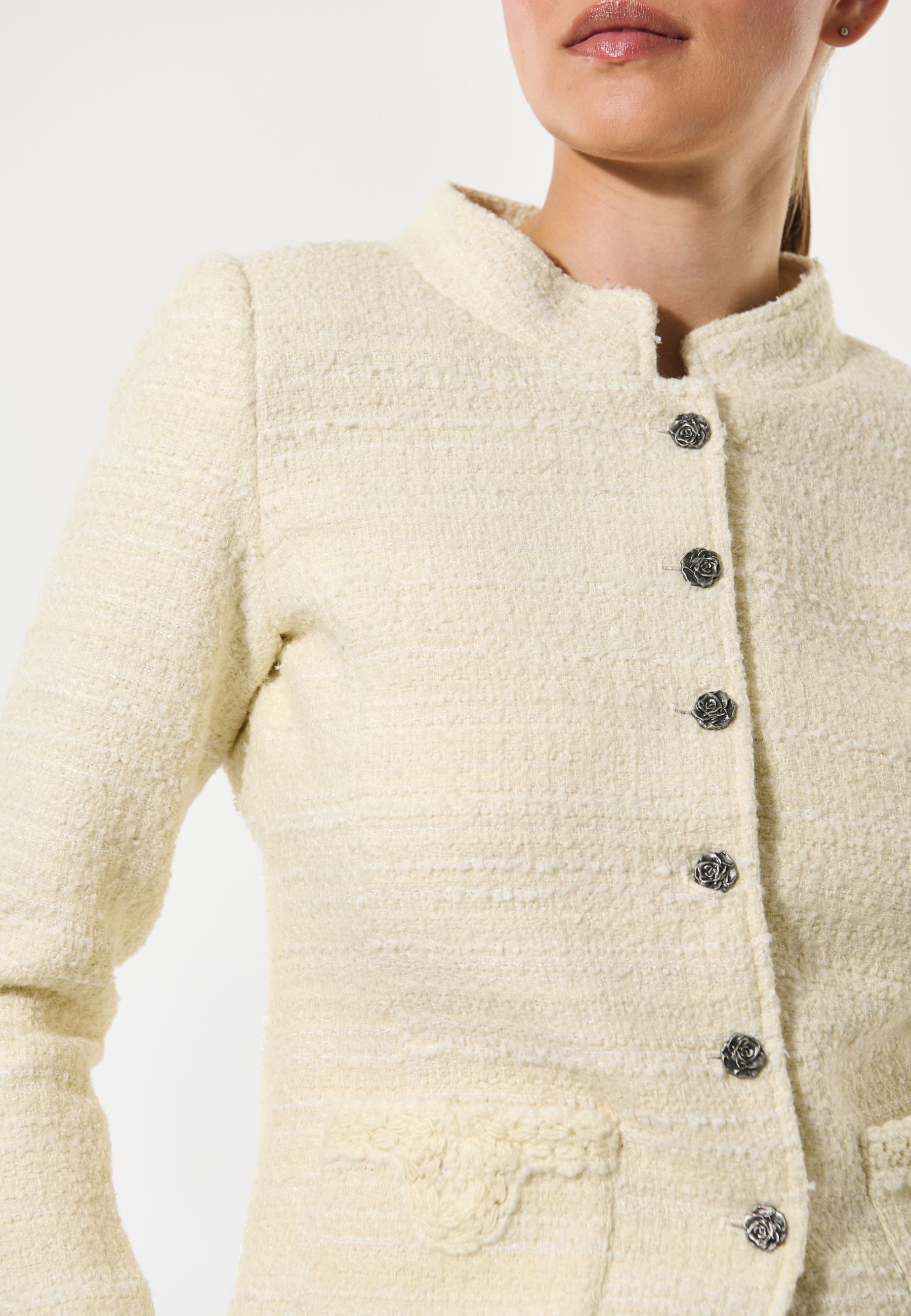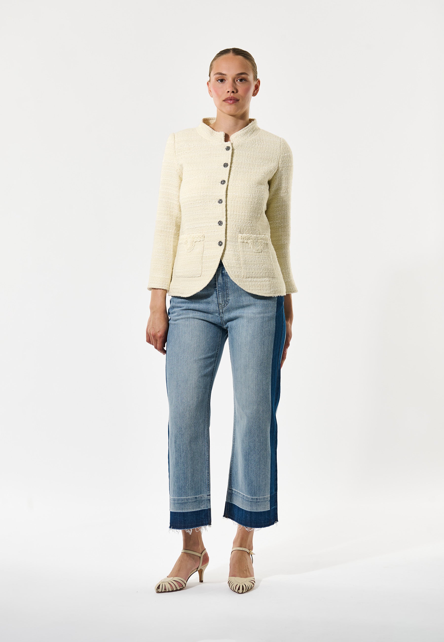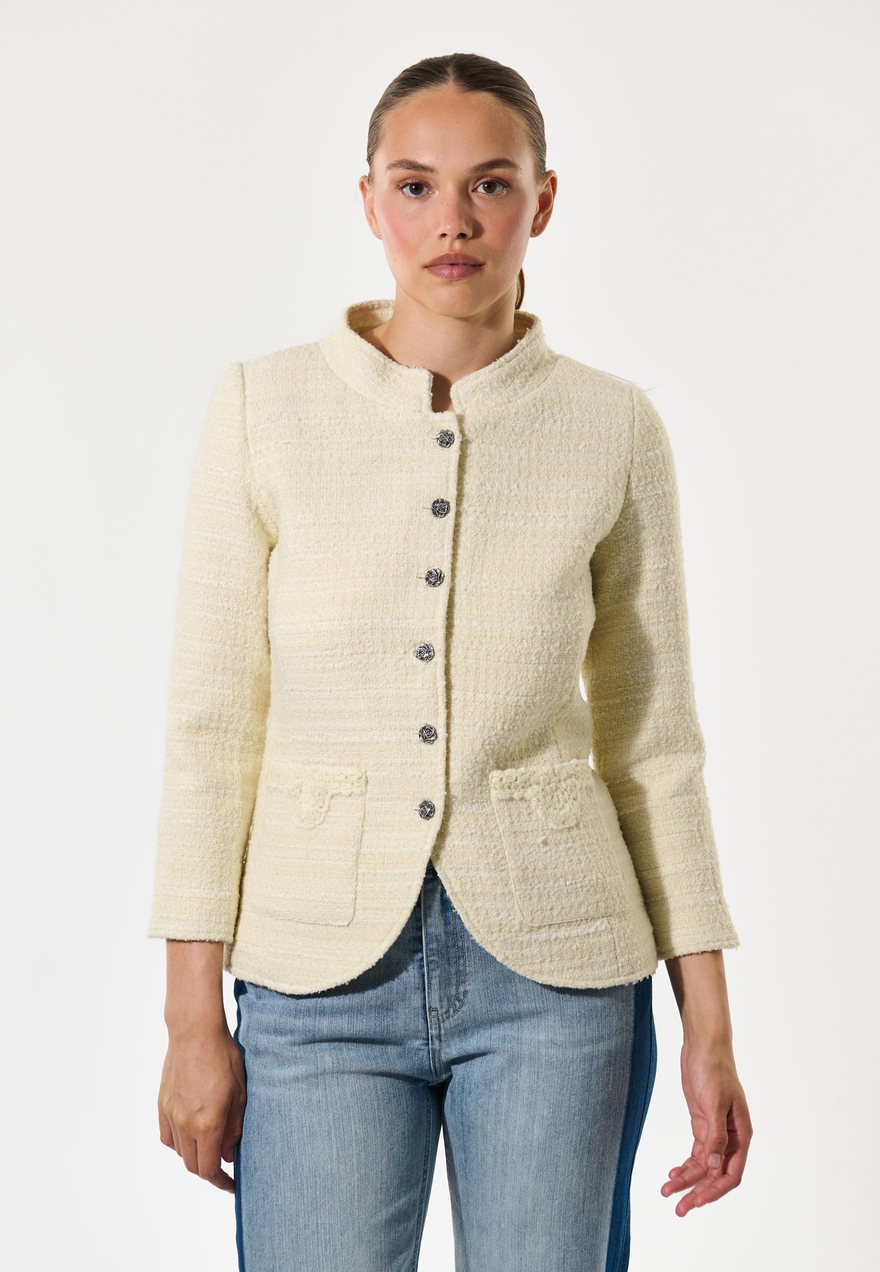 Cool taljeret jakke med kinakrave og buet lukning.