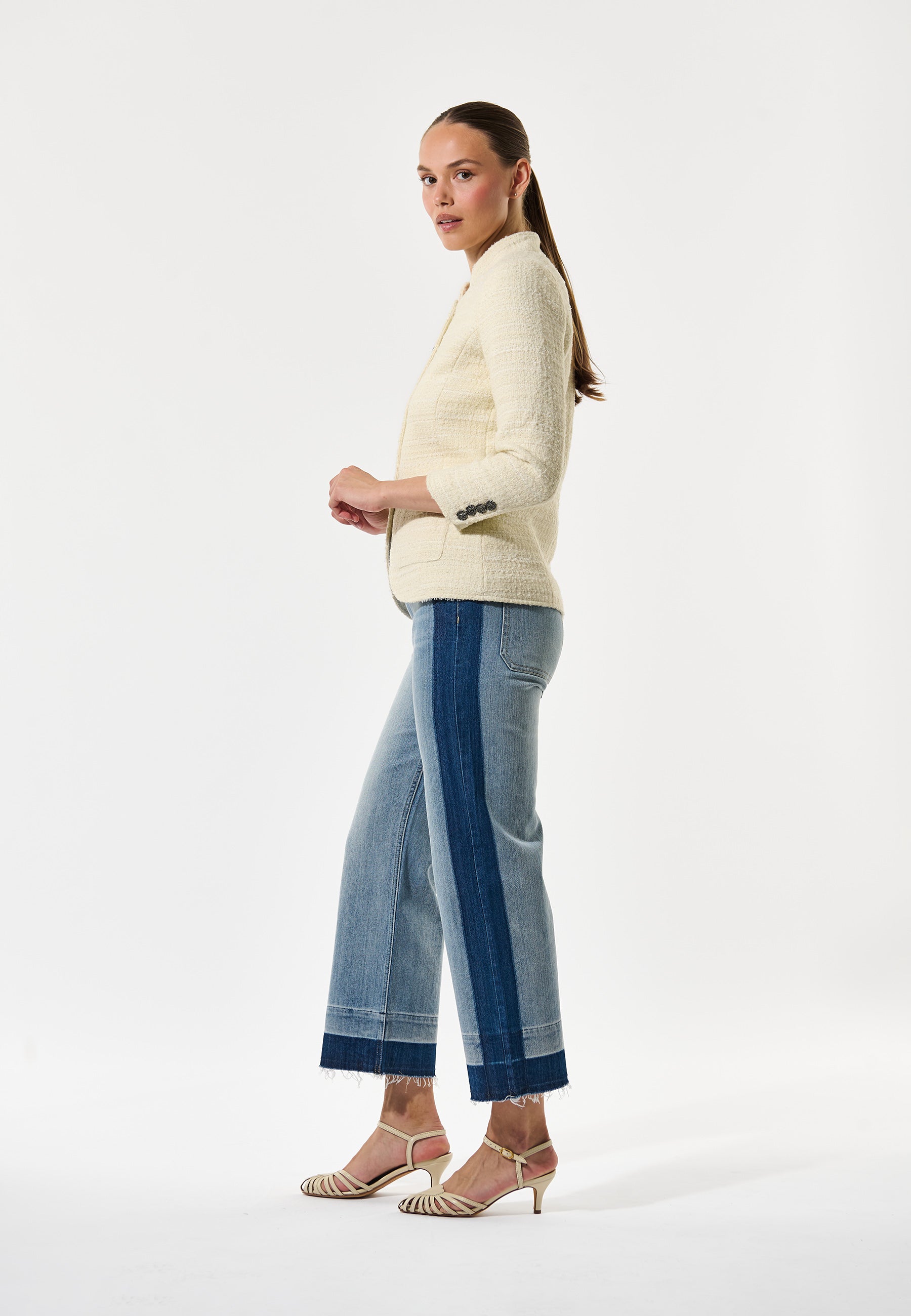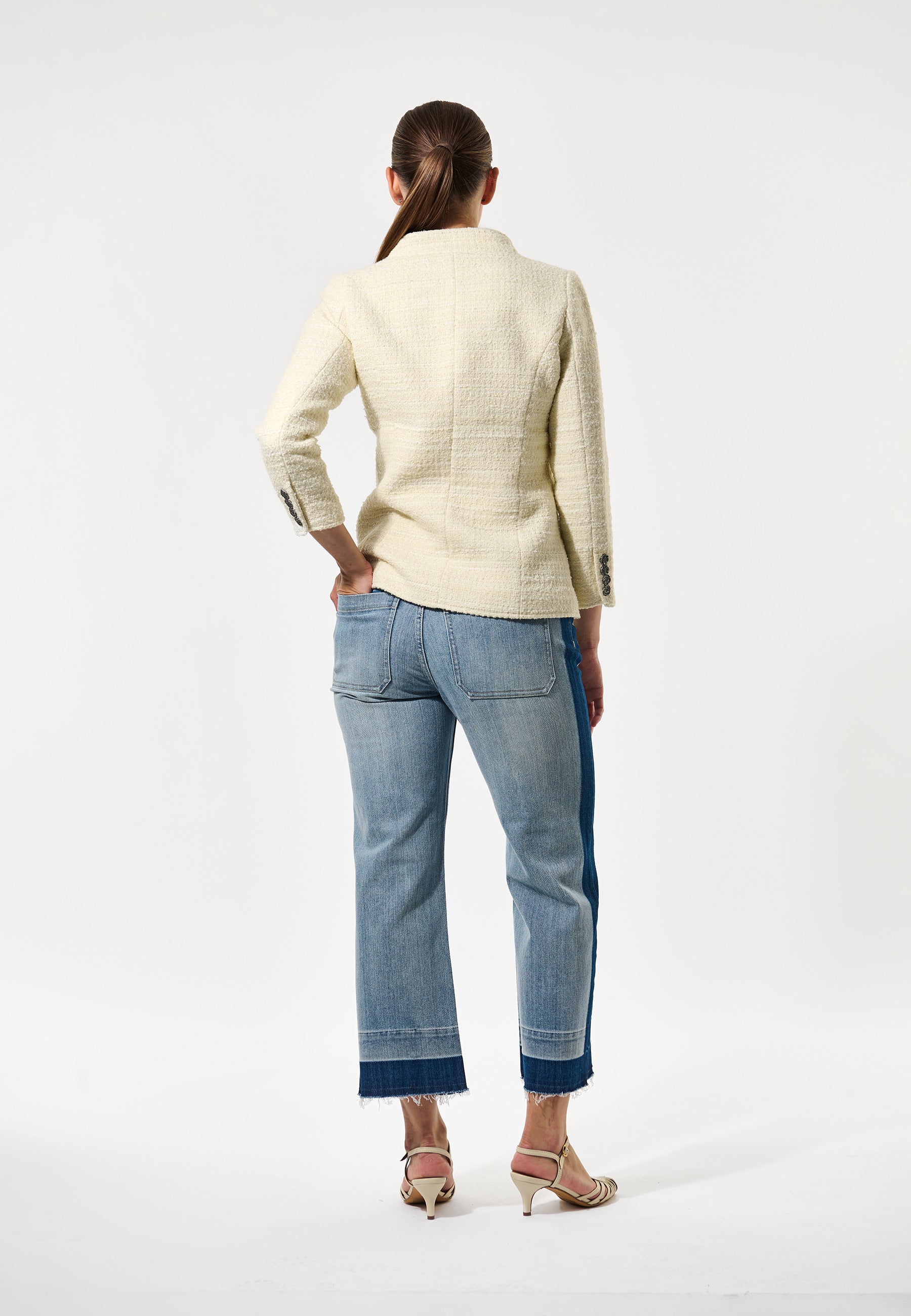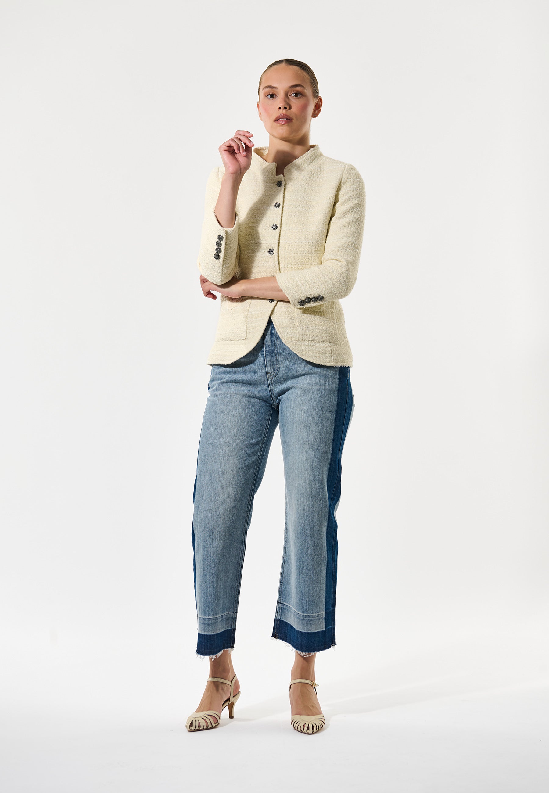 Cool taljeret jakke med kinakrave og buet lukning.